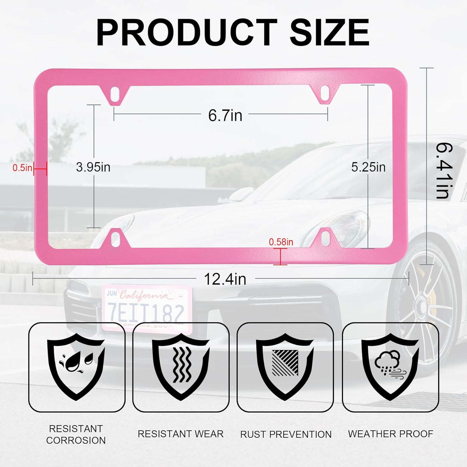 - Hardware included: 2 pcs License plate frames, with 4 Screw Caps (plastic), 4 Self-tapping Screws, 4 Machine Screws, 4 Washers (plastic), 1 Screwdriver.Frame size: 12.3 "x 6.3". Internal dimensions: 11.4 "x5.3 ".