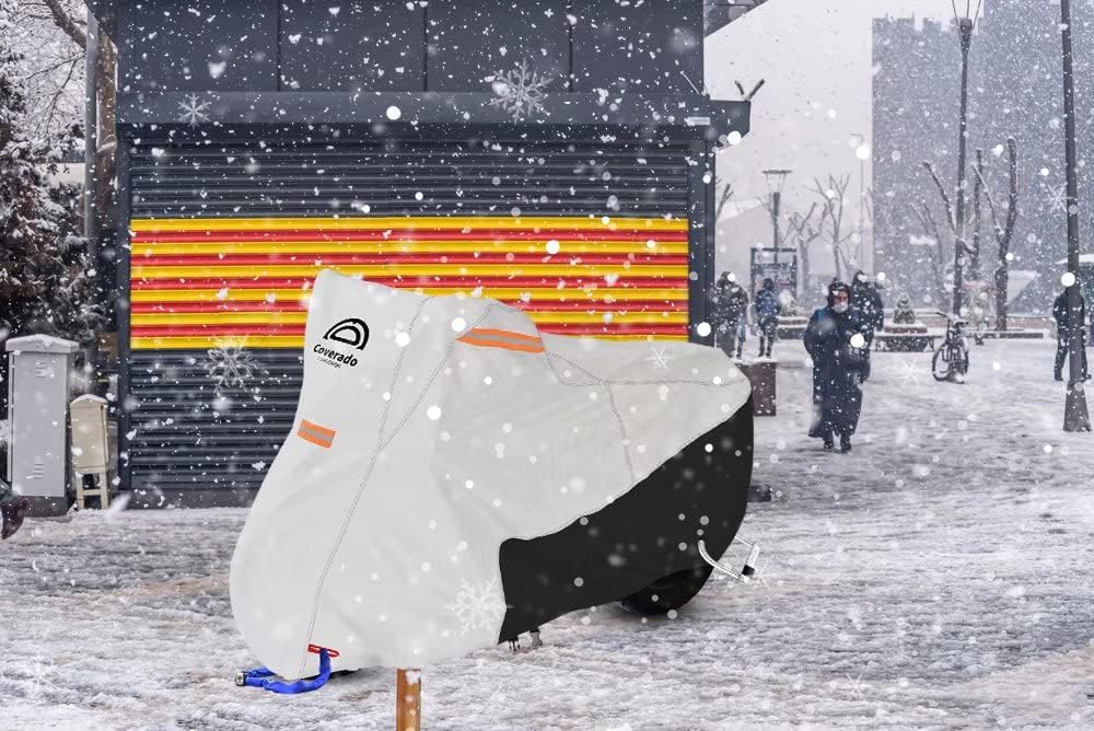 - All Season Waterproof & Windproof Protection: Coverado heavy duty motorcycle cover can handle it all no matter hot sun or cold weather. The strengthful material keeps your car safe from UV rays, snow, frost, rain, sand, dust, leaves, branches and birds dropping.