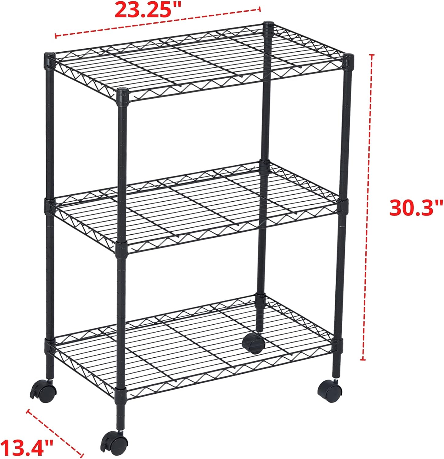 - This black 3 tier wire rack shelving units include nylon wheels (2 Locking), as well as 4 leveling wide feet for mobility.