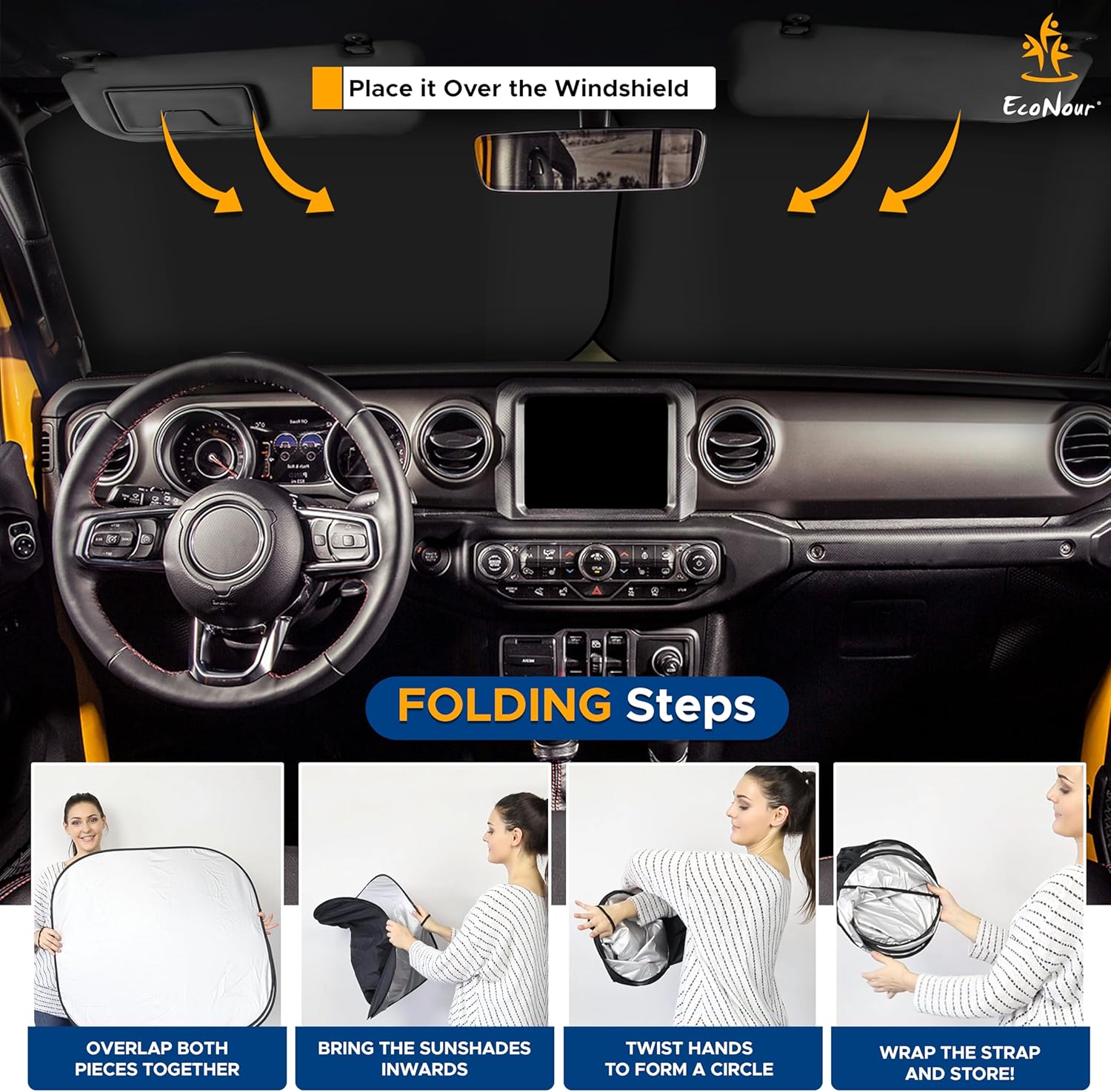 - Ultimate Sun Protection: Shield your vehicle's interior from the sun's harmful UV rays with our EcoNour 2-Piece Windshield Sun Shade, ensuring comprehensive sun protection on every drive.