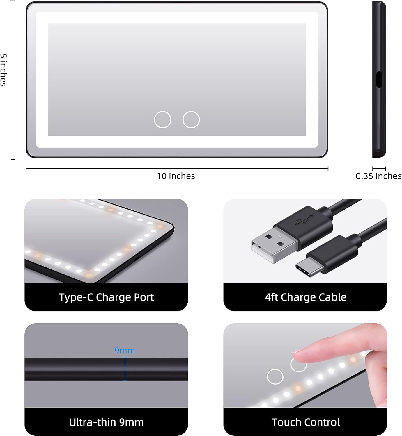 - USB RECHARGEABLE - Built-in 2000 mAh lithium battery, which can be charged by car, socket, computer, mobile power, free to use the vanity mirror at anywhere and anytime. It can last 8 hours if 100% brightness while always On mode.