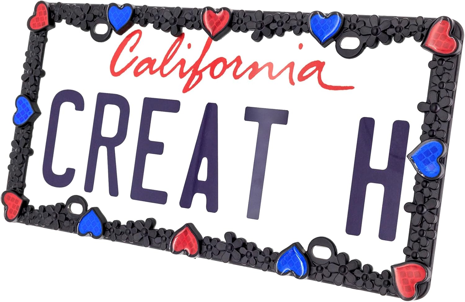 Creathome 3D Daisy Heart License Plate Frame from Pure Zinc Alloy Metal Perfect Plate Holder, Matt Black Daisy with Red and Blue Reflective Heart