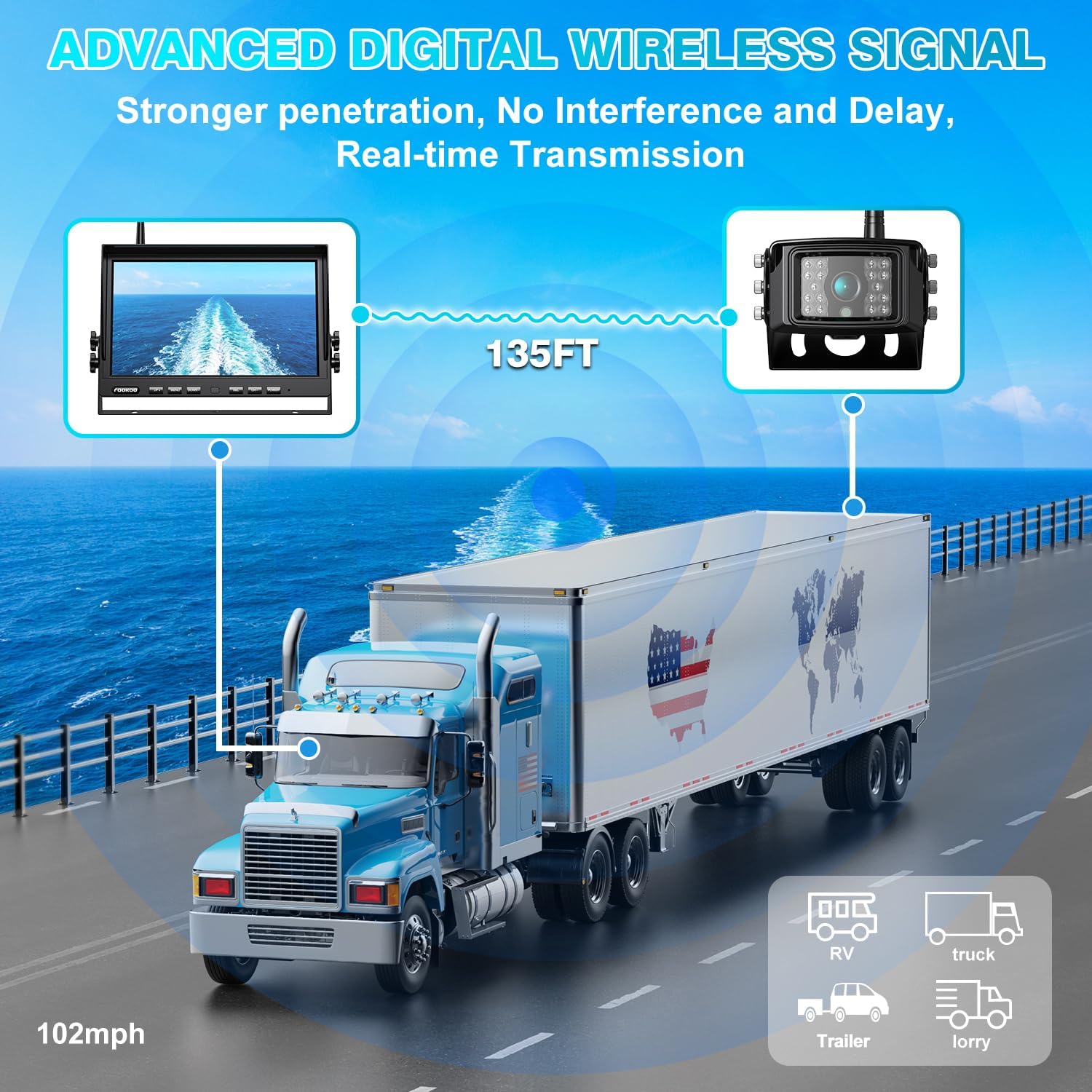 - 【Advanced Digital Wireless Signal】The system with stable digital signal works flawlessly within 128ft range in open area, enough for any large vehicles. Even at the high speed of 102mph, the monitor will display the surroundings in real time, making your driving more convenient. There is no interference, flicker, blurring or delay.