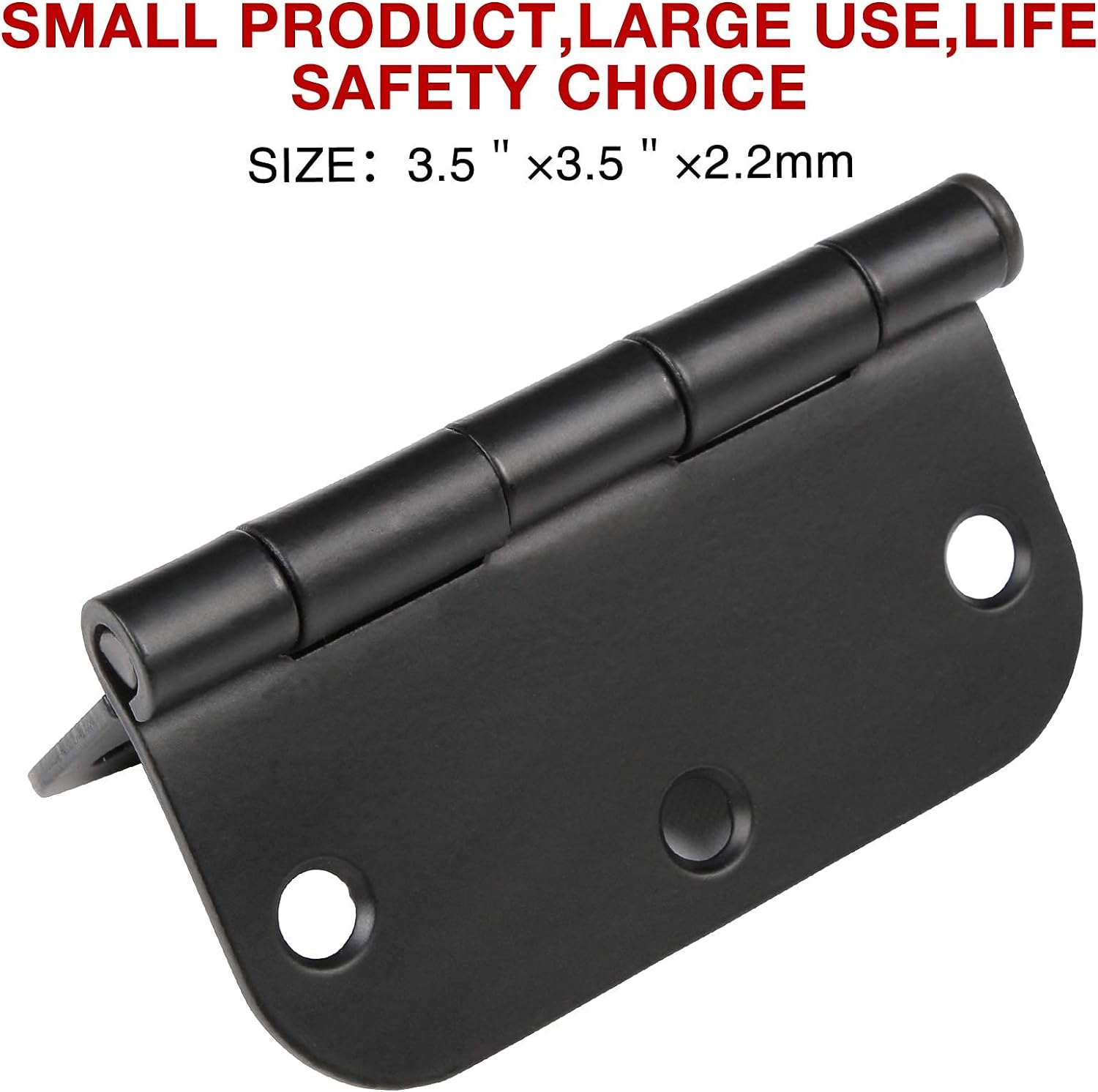 - Door hinges Black Matte 3.5 inch with 5/8 rounded corners and 6 holes for front door,cabinet,wooden box.Safe black door hinges 3.5" Includes 180 free screws for quick and easy installation.Mat black door hinges can be rotated 270 degrees.The extra long screws will come in handy specially when replacing existing hardware using the same hole pattern.