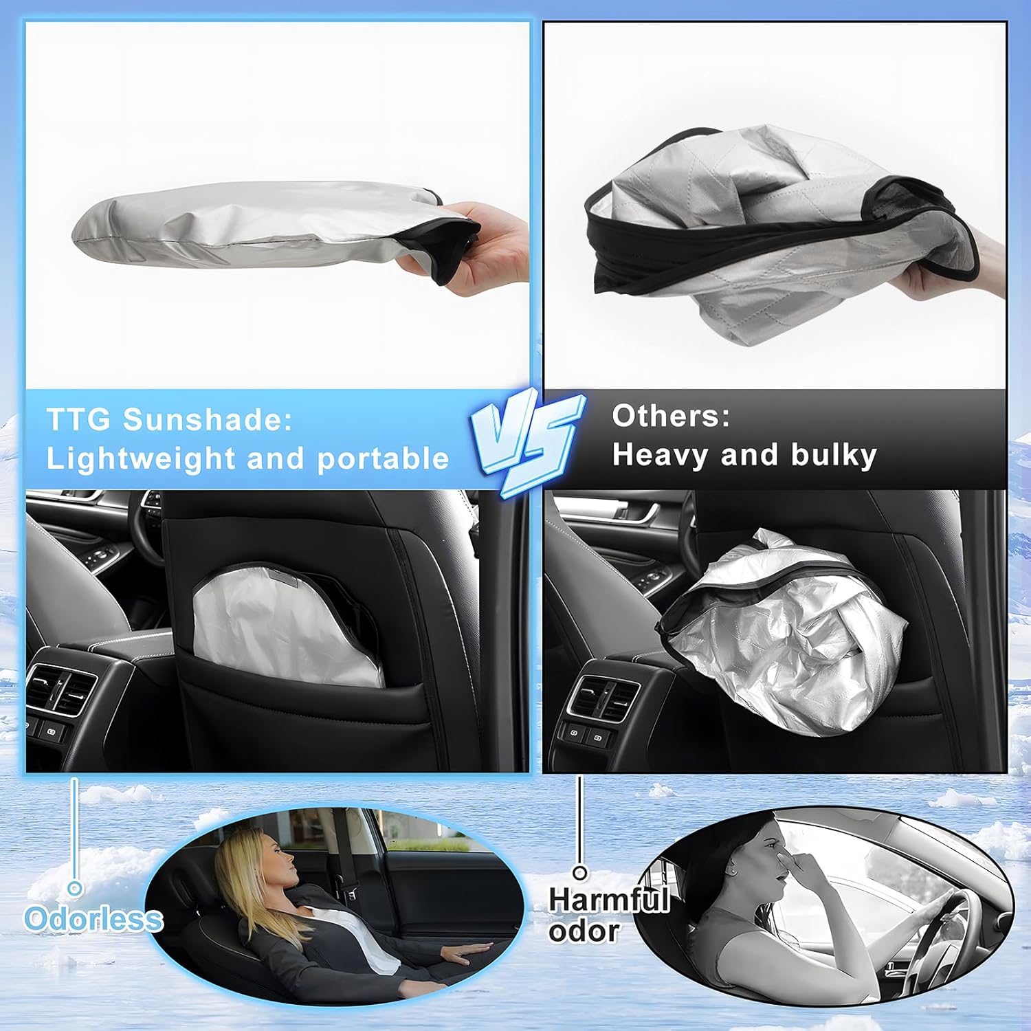 - Premium Material - Abandoning traditional silver-coated fabric, T TGBROS sun blocker for car windshield adopted a 310T high-density base fabric combined with a polyester fiber high-temperature reflective cooling coating, newly Upgraded.