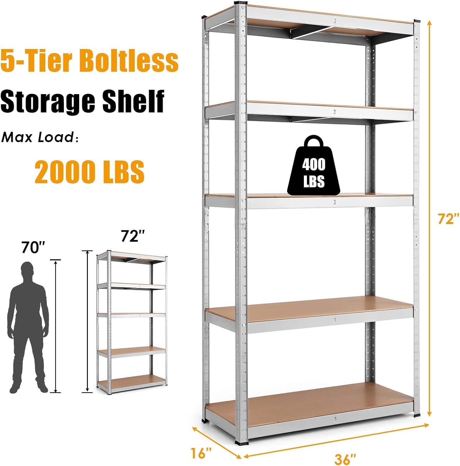 ERGOMASTER 5 Tiers Steel Shelves for Storage Heavy Duty Garage Organization Utility Shelf Rack for Books, Kitchenware and Tools Bolt-Free Assembly 72 x 16 x 72 inches (Set of 2,Silver)