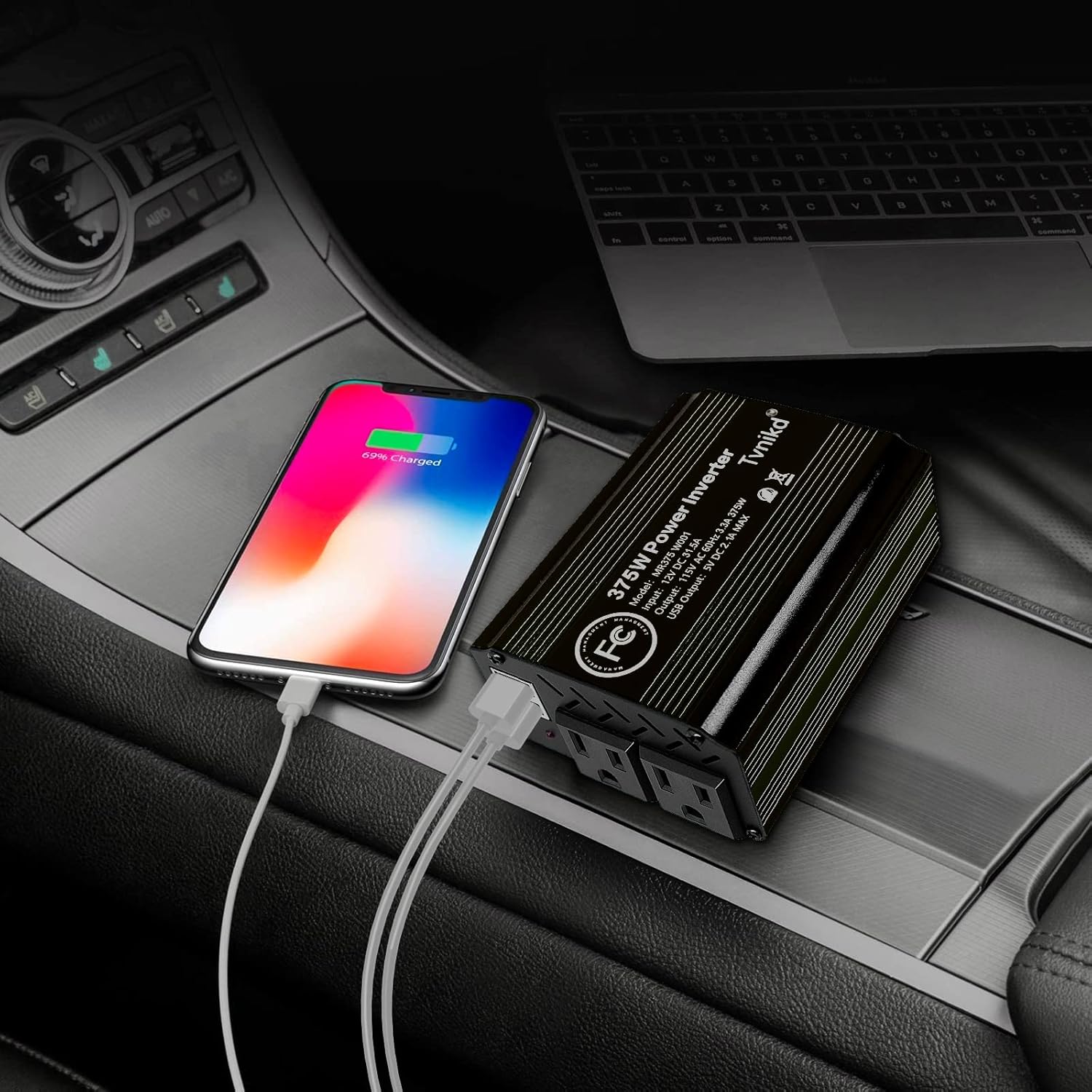 - 1.【Feature】Featuring with 2 AC outlets and 2 smart 2 A USB ports. TVNIKD 375W car power inverter provides standard 110V AC, rate 375W, up to 750W peak power output just to connect it with a 12V DC battery.