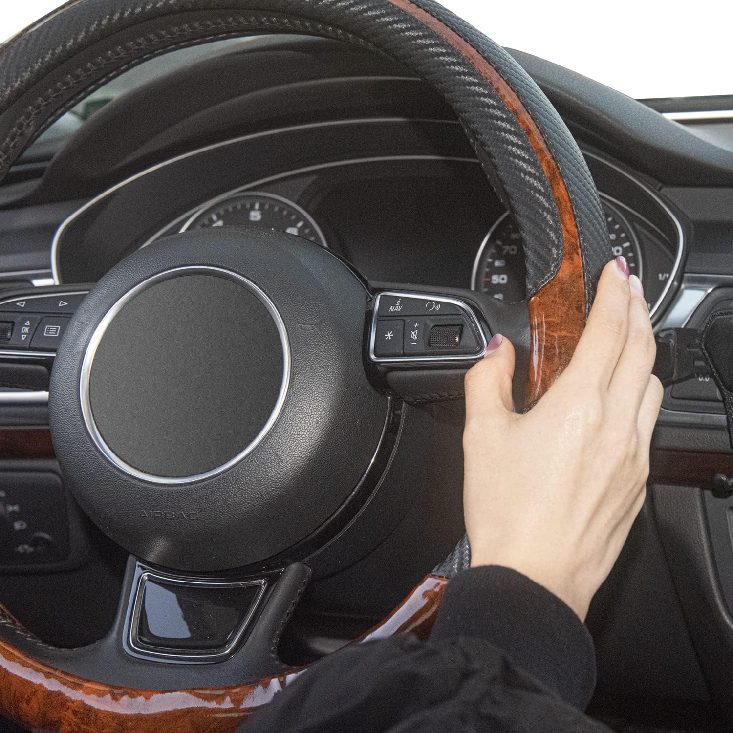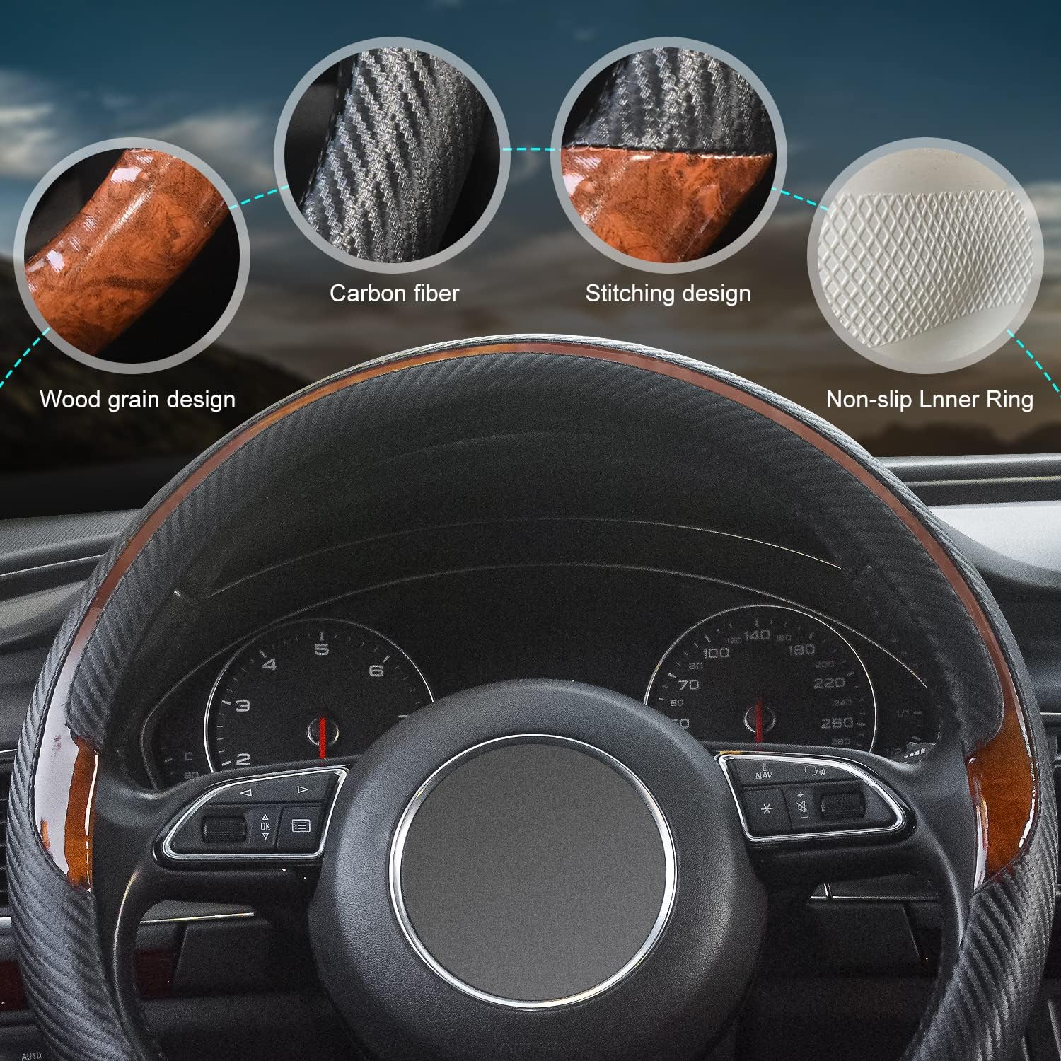 - Wood Grain Design: Well-designed wood grain with the glossy carbon fiber material is very suitable for your car interior. Coupled with superb stitching craftsmanship, it is the best choice for your car decoration. While protecting the steering wheel, it also helps reduce driving fatigue and enhance driving pleasure.