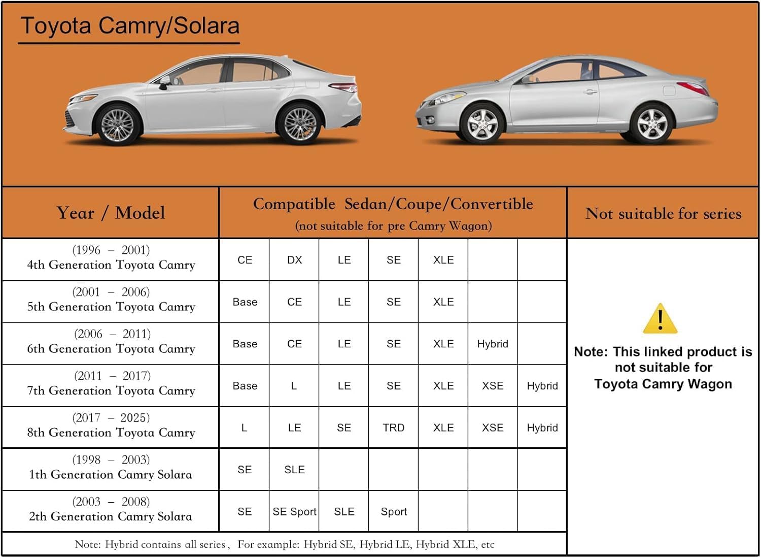 - 【Suitable for】— Custom fit for Toyota camry Sedan/Coupe/Convertible CE/ DE/ LE/ SE /XLE /Base/Hybrid Etc(1996-2025), Not suitable for camry wagon. Cover length:193''L x 72''W x 59''H, you need to measure your for car length from the front bumper to back bumper, If you are still unsure, please refer to Figure 5 or consult customer service.