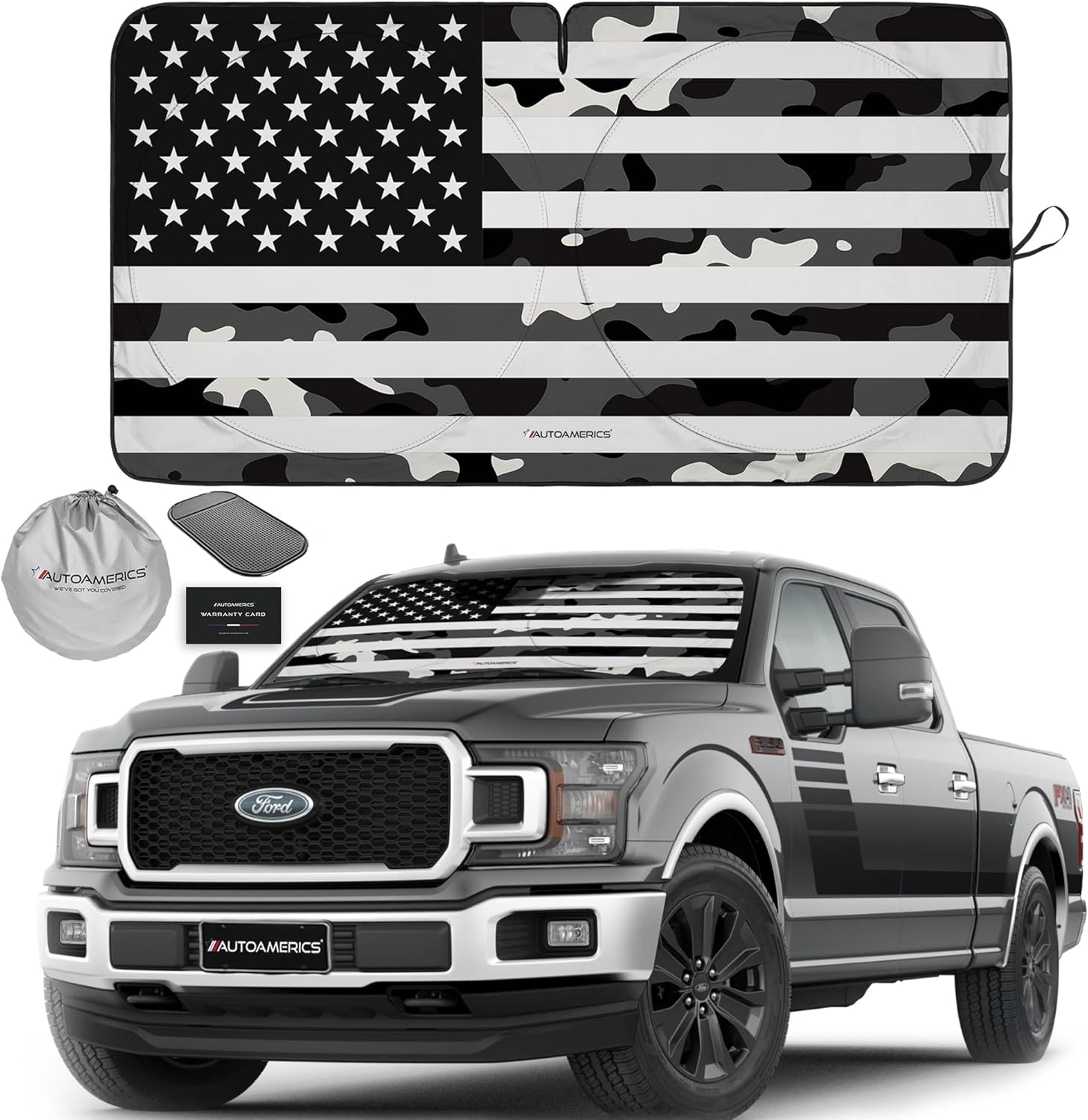 Autoamerics Truck Windshield Sun Shade with Storage Pouch & Anti-Slip Dash Pad - Foldable B&W Camo USA Flag Design - Fits Most SUVs & Trucks - Blocks UV Rays and Keeps Car Cool | XL (66 x 36 inches)