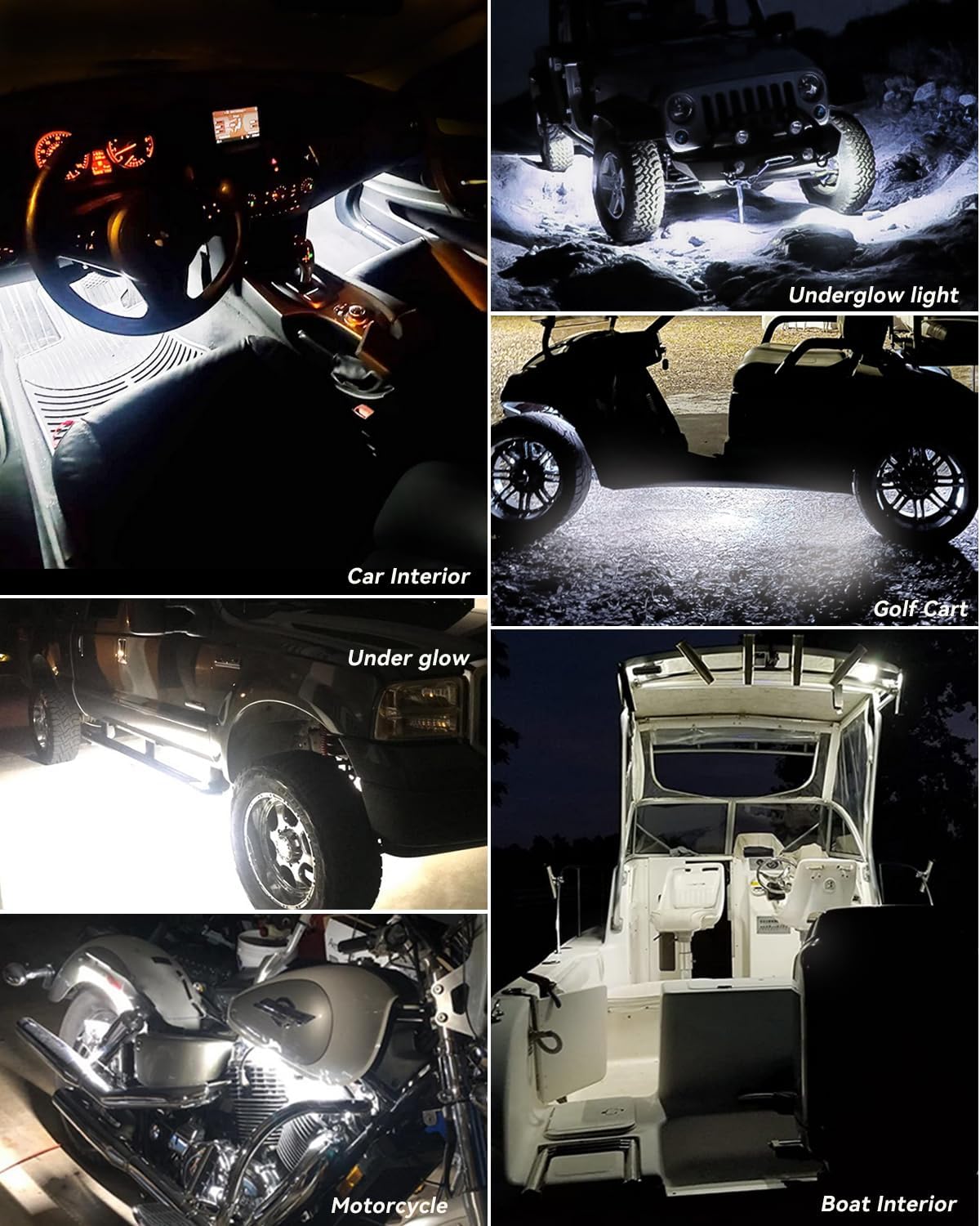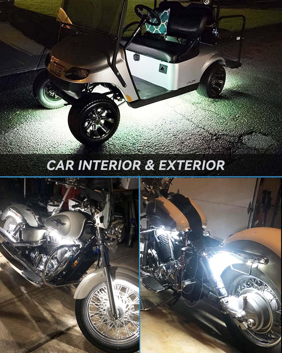 - Recommended Uses For Product : Car Underglow Lights, Golfcart Led Lights, Pontoon Fishing Boat Yacht Kayak Sailboat, Vehicle Exterior, Vehicle Interior, motorcycle led strip lights Car Underglow Lights, Golfcart Led Lights, Pontoon Fishing Boat Yacht Kayak Sailboat, Vehicle Exterior, Vehicle Interior, motorcycle led strip lights