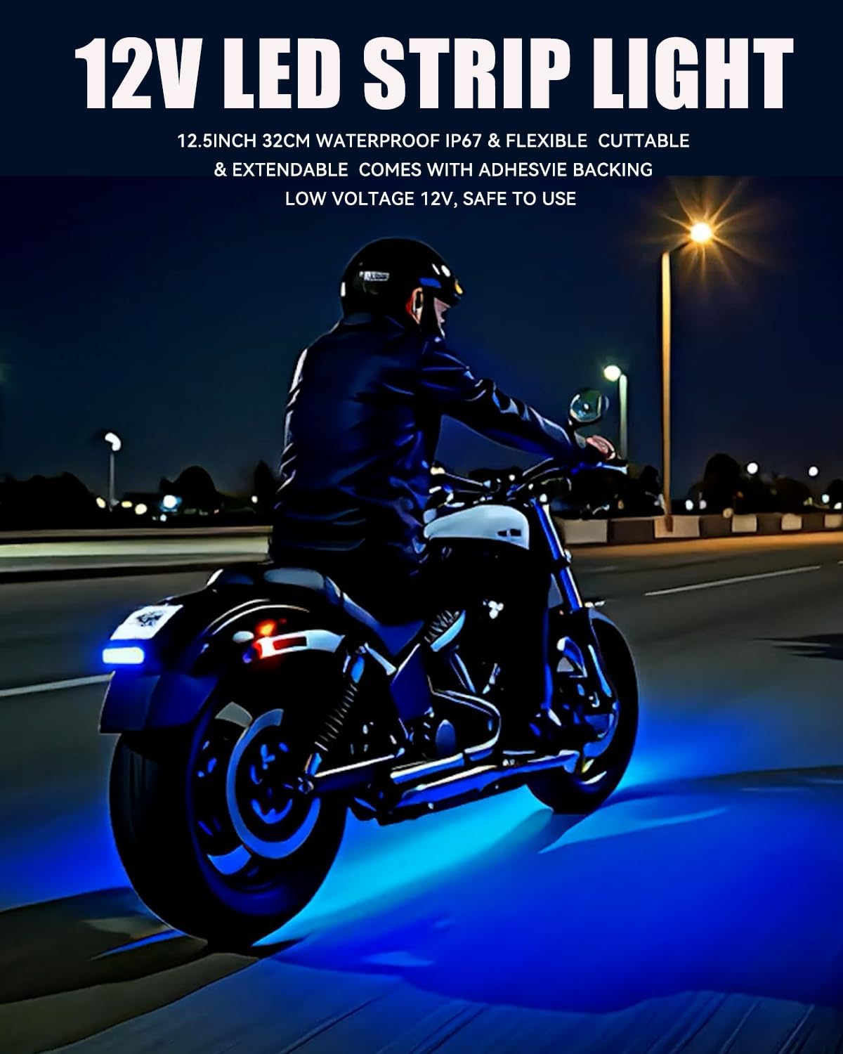 - 【Features】--- 4pack 32.3cm 12.75inch 5050 18smd led strip lights for motorcycle led underglow kit cars, blue led strip length: 32.3×1.2×0.6cm(L*W*H), lead wire length: 100cm, output: 0.1A @ 12V-DC