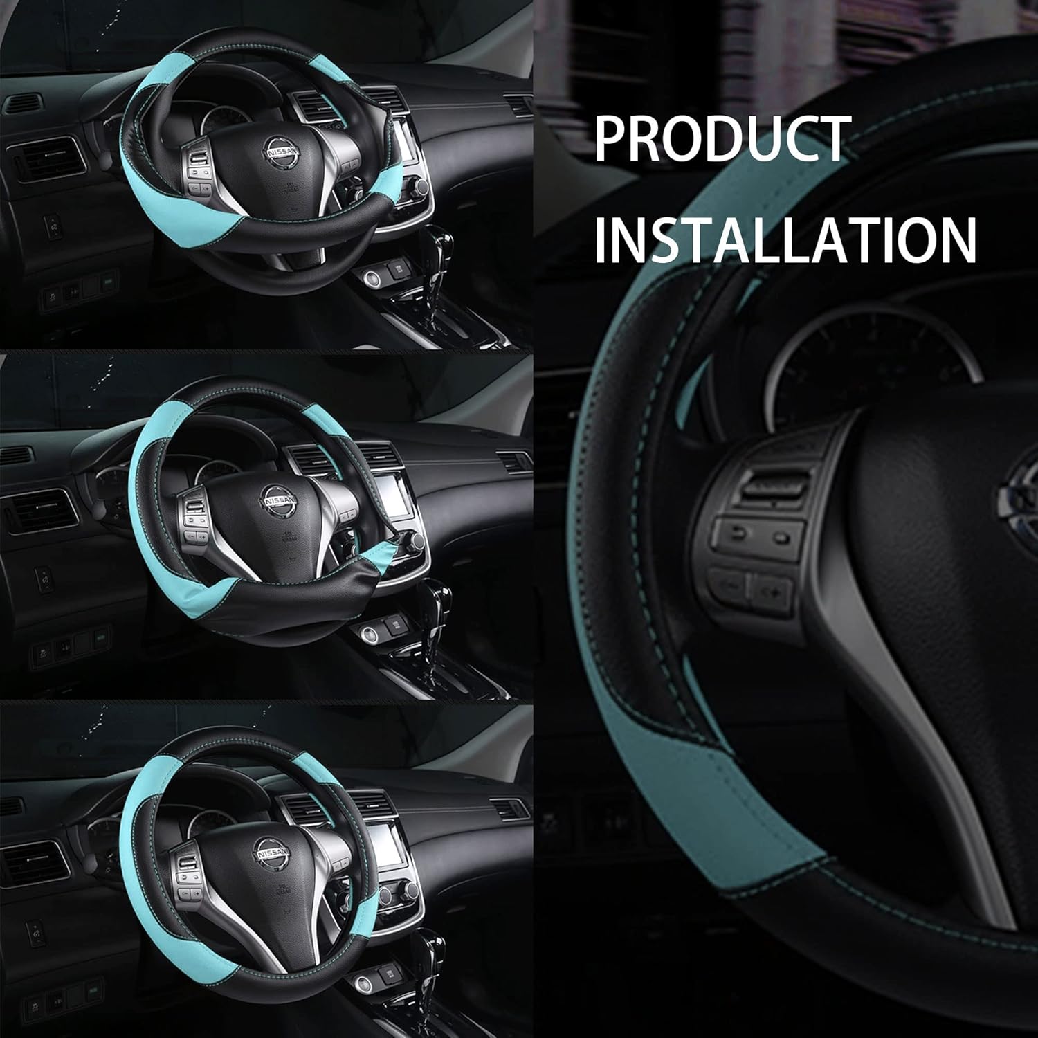 Leather Car Steering Wheel Cover, Non-Slip Car Wheel Cover Protector Breathable Microfiber Leather Universal Fit for Most Cars (Blue)