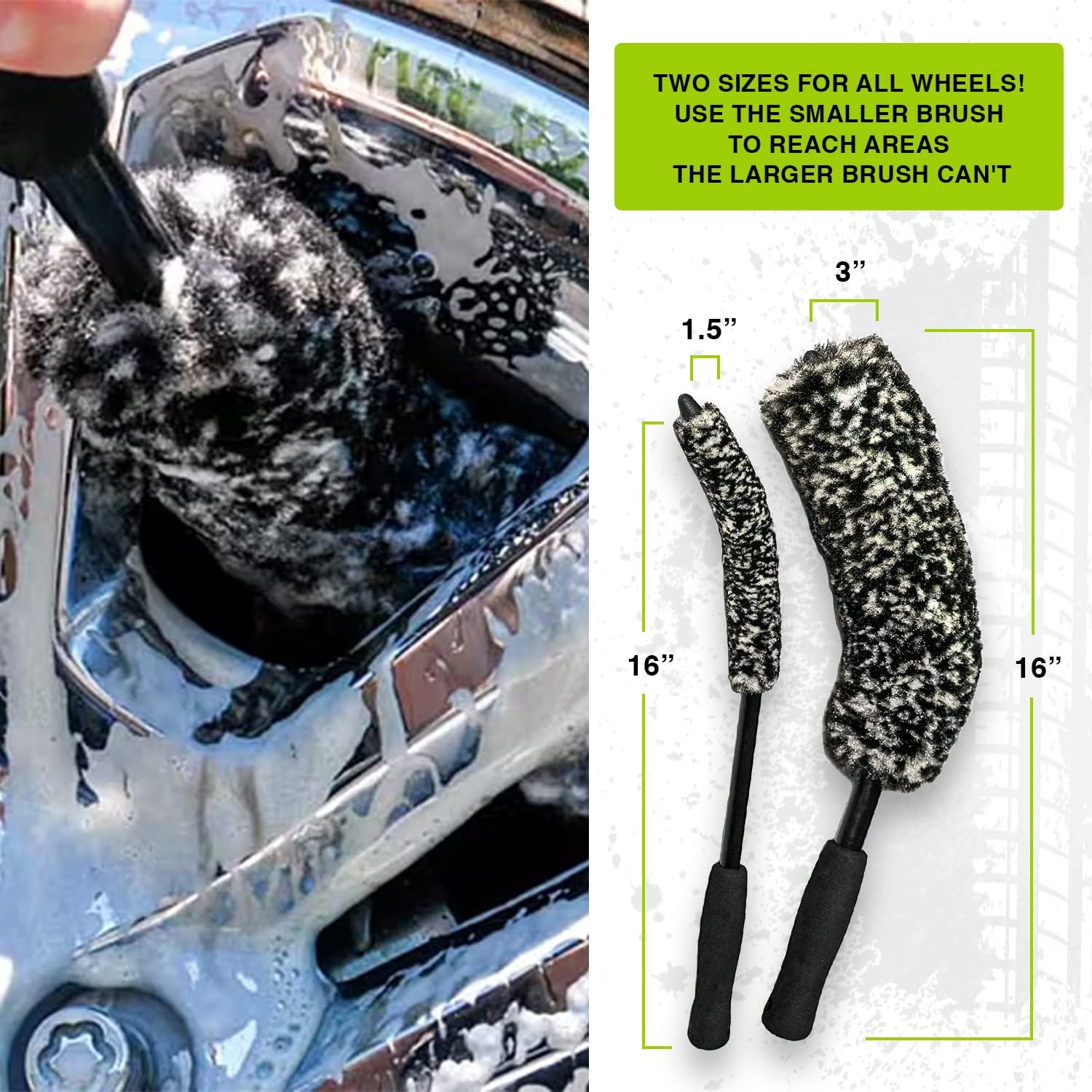 - DOUBLE UP FOR CLEANER WHEELS: No matter what wheel or spoke design your vehicle has, this 2-in-1 Bendable Brush Set achieves what is impossible for a single brush. Clean every area of your wheels quickly and easily without having to remove them. The large brush measures 16" long and features 3” wide fibers. The smaller brush measures the same length but features 1.25” fibers.