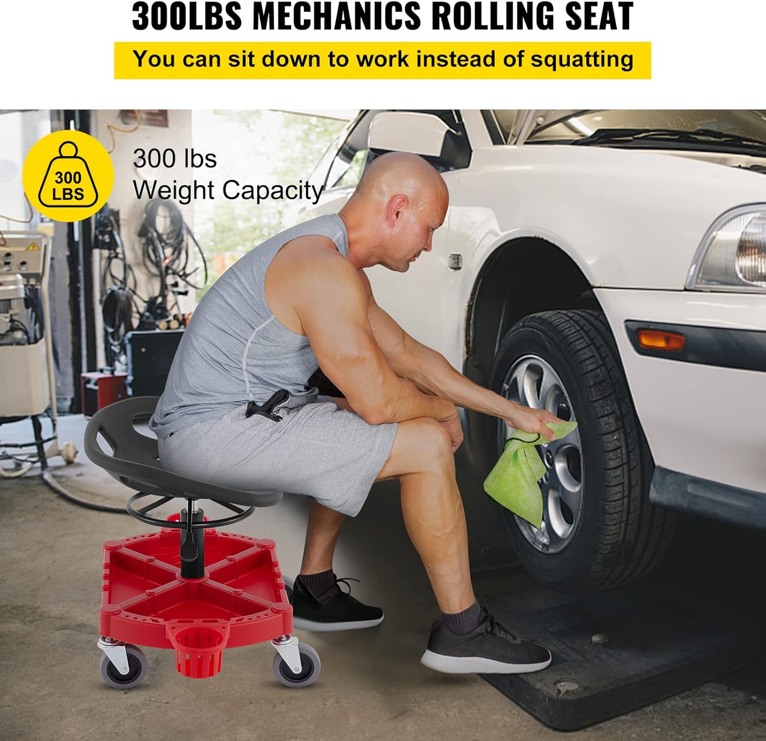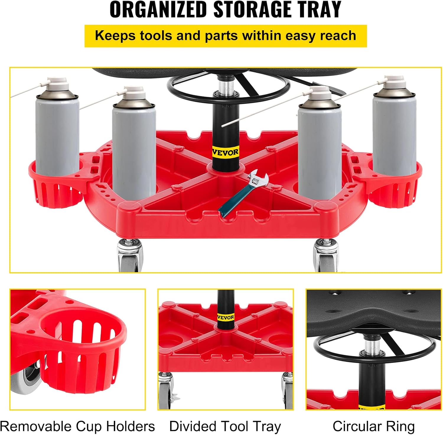 VEVOR Rolling Garage Stool, 300LBS Capacity, Adjustable Height from 18 in to 23 in, 360-degree Swivel Wheels (4"), Large Tool Tray with Two Bottle Holder, for Workshop, Auto Repair Shop, Red