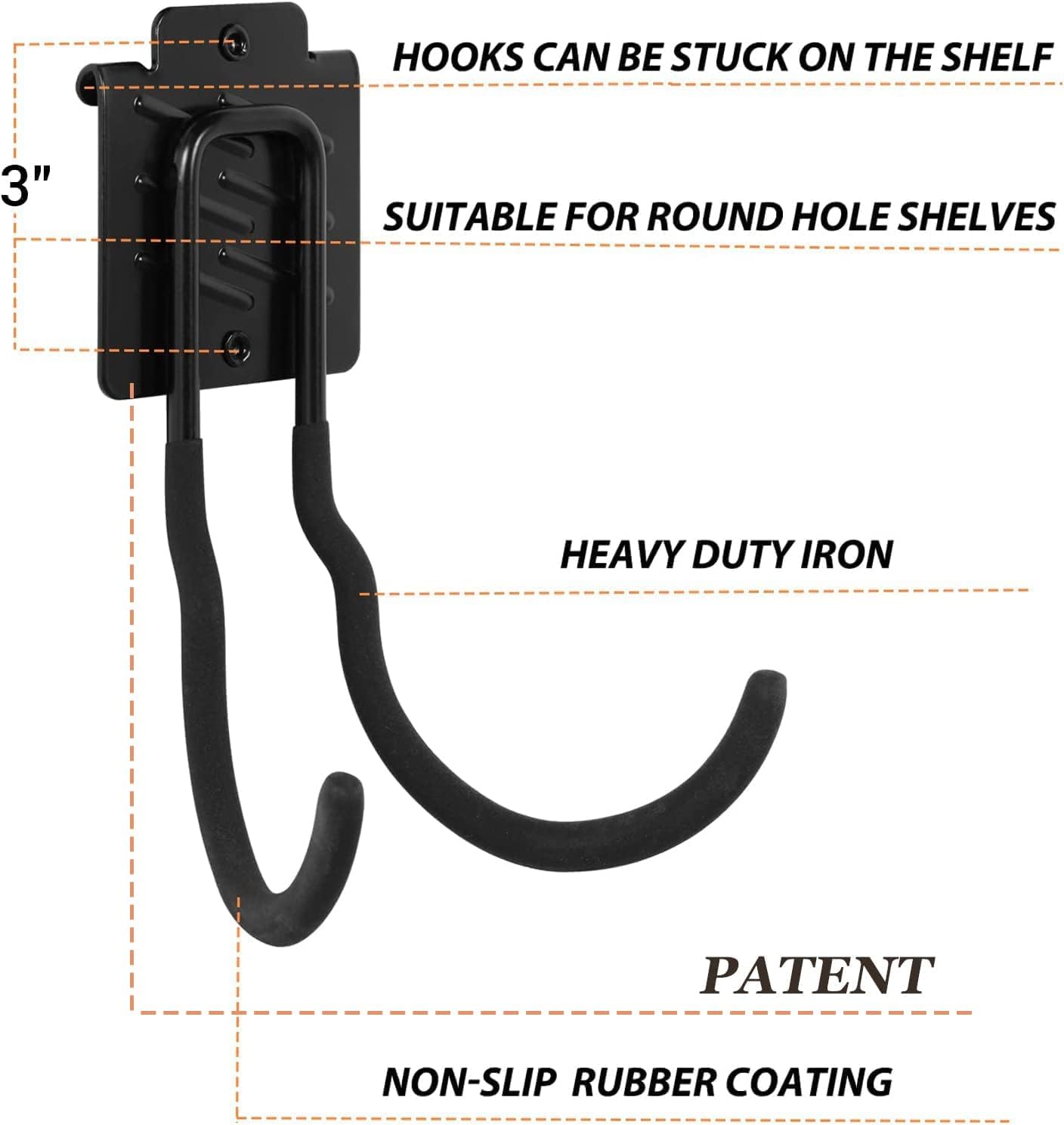 - ANTI-SCRATCH RUBBER HOOK : The non-slip rubber coating is designed to hold the items firmly, which could protect their surfaces from getting scratched or damaged, and also could prevent the garage storage hooks from slipping and rusting.