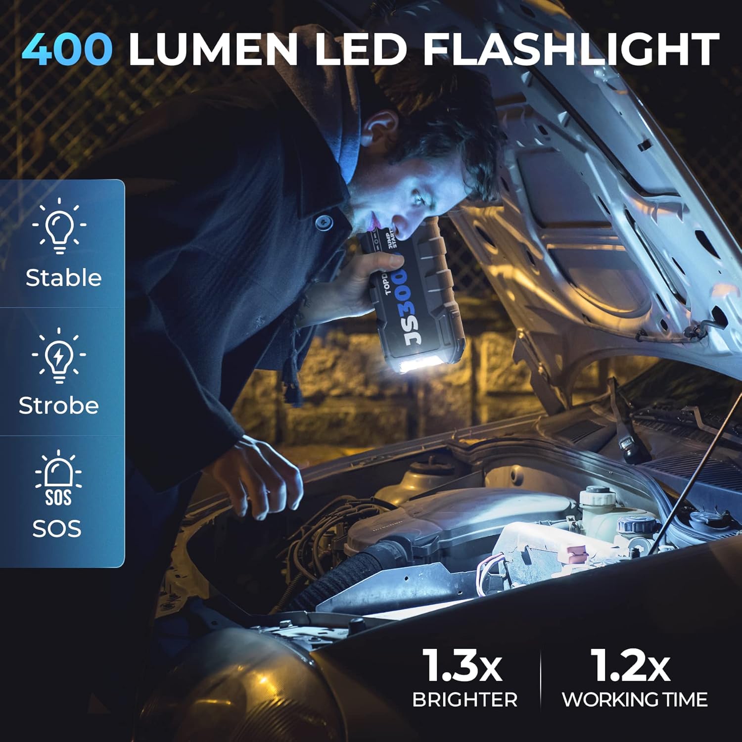 - 【MORE THAN A JUMP STARTER】The JS3000 also serves as a portable 24000mAh power bank with 2 USB QC 3.0 ports, a 16.8V DC port, and a Type-C PD45W bi-directional charging port (charging your laptop from 0% to 100% in 2 hours or other devices in 1 hour). It has a super bright flashlight, providing you with 400 lumens of light, a SOS signal light in an emergency or outdoor adventure. When fully charged, the flashlight can be powered on for up to 30 hours.