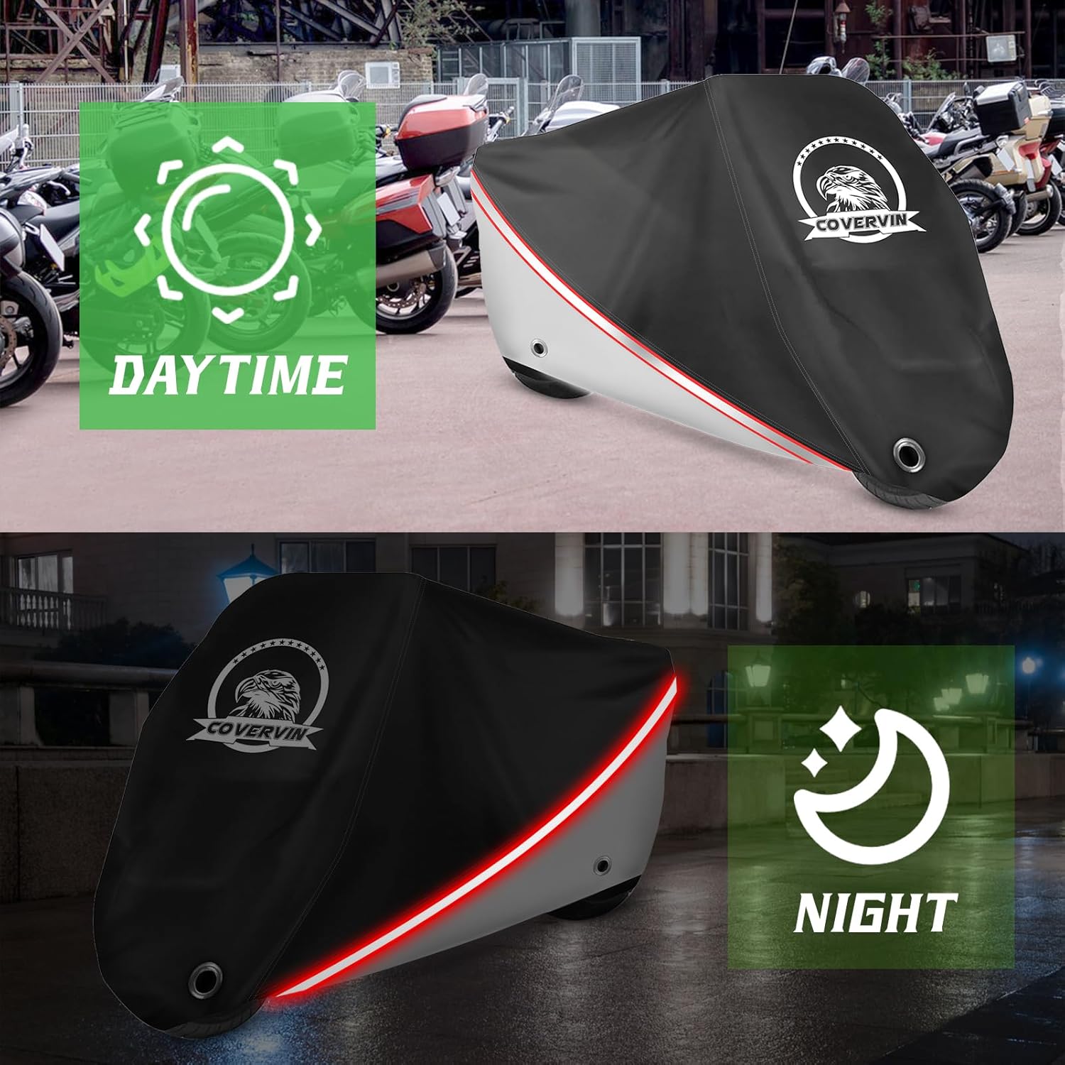 COVERVIN Motorcycle Cover, All Weather Outdoor Waterproof Night Protection with Reflective Strips, Locking Holes and Storage Bag for 86 Inch Suzuki, Kawasaki, Honda, Harley-Davidson(Silver M)