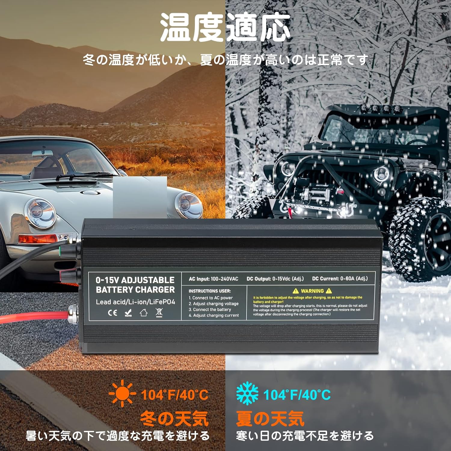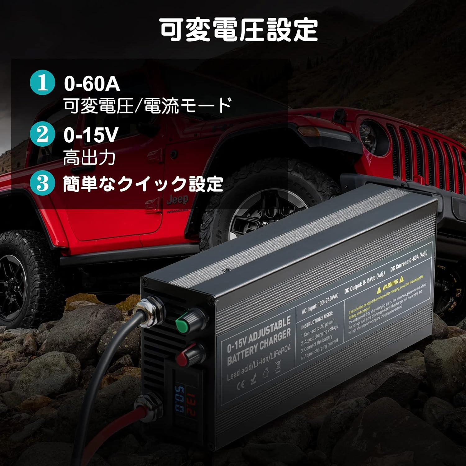 - ✔【Designed for Lithium-Ion Batteries】Capacity. Li 12.6V 14.6V 60A LiFePO4 Lithium Battery Smart Charger is specially designed for 12.8V LiFePO4 battery or 12.6V Li-ion battery, the voltage is adjustable, the range is 0-15V adjustable. Do not use the charger on a metal surface platform. Buyers have any questions please email me. We will help you solve it as soon as possible.