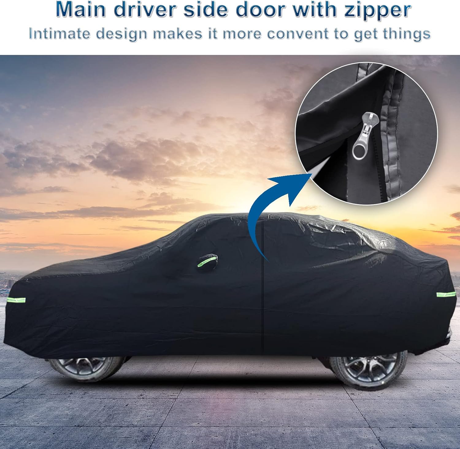 - 【Reflective Strips and Driver-Side Zipper Designs】(1) Black Coating: UV protection and heat-proof,prevent cracking and aging of inner decoration leather and plastic. (2)5 Reflective Strips attached on the front DRL lamps, middle Turning lights and Rear taillight to prevent collisions during the night.(3)It comes with four straps,a windproof buckle, a security lock and a storage bag.(4)Mirror Pocket: protect rear view mirror in all directions. (5) A zipper on the cab side for convenience.