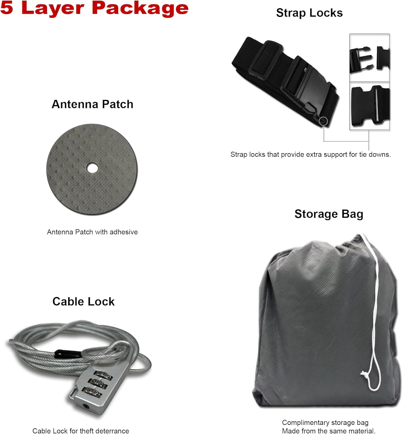 - Complimentary 4 way buckle straps system, antenna reinforcement patch, and storage bag included with purchase.