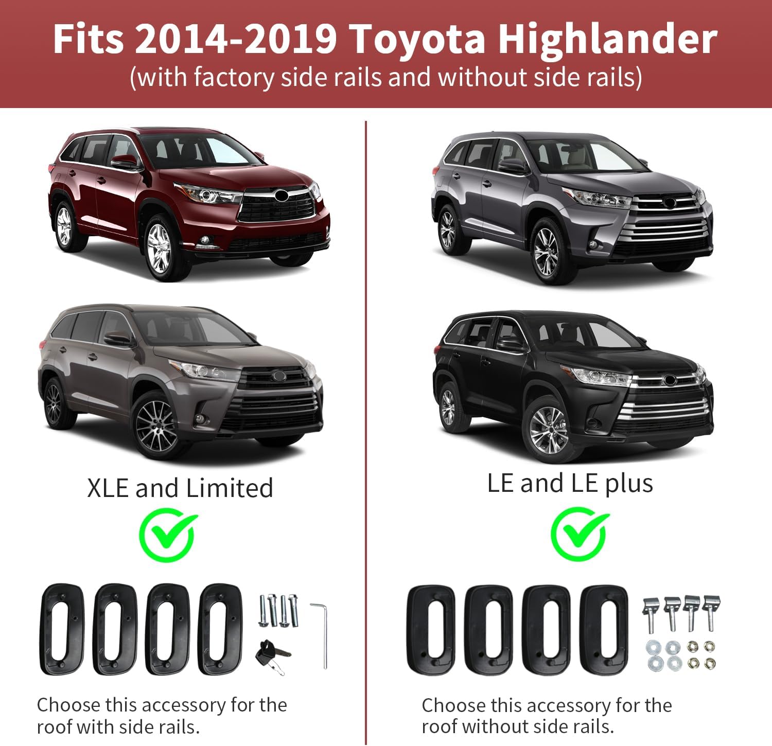 - 【Excellent fit】These roof rack crossbars are specifically replacements for Toyota Highlander 2014-2019 (with actual side rails and without side rails). There are two packages of accessories in each set. One for XLE, Limited and Limited Platinum models. Other fit for LE and LE Plus models.Please make sure it fits your vehicle before purchasing.