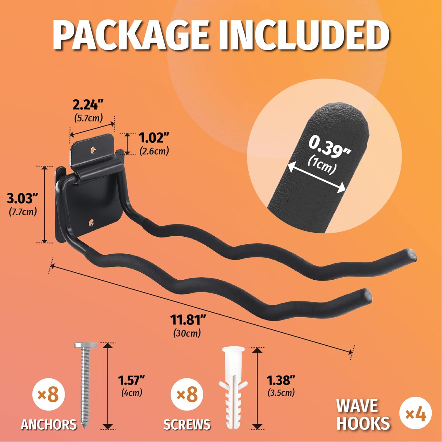 - EASY INSTALLATION - Step 1: drill pilot hole on the wall. Step 2: screw in the anchor and screw Step 3: finished, ready to hang all the things. The package includes 12” wave curved garage hooks x4, anchors x8 and screws x8.