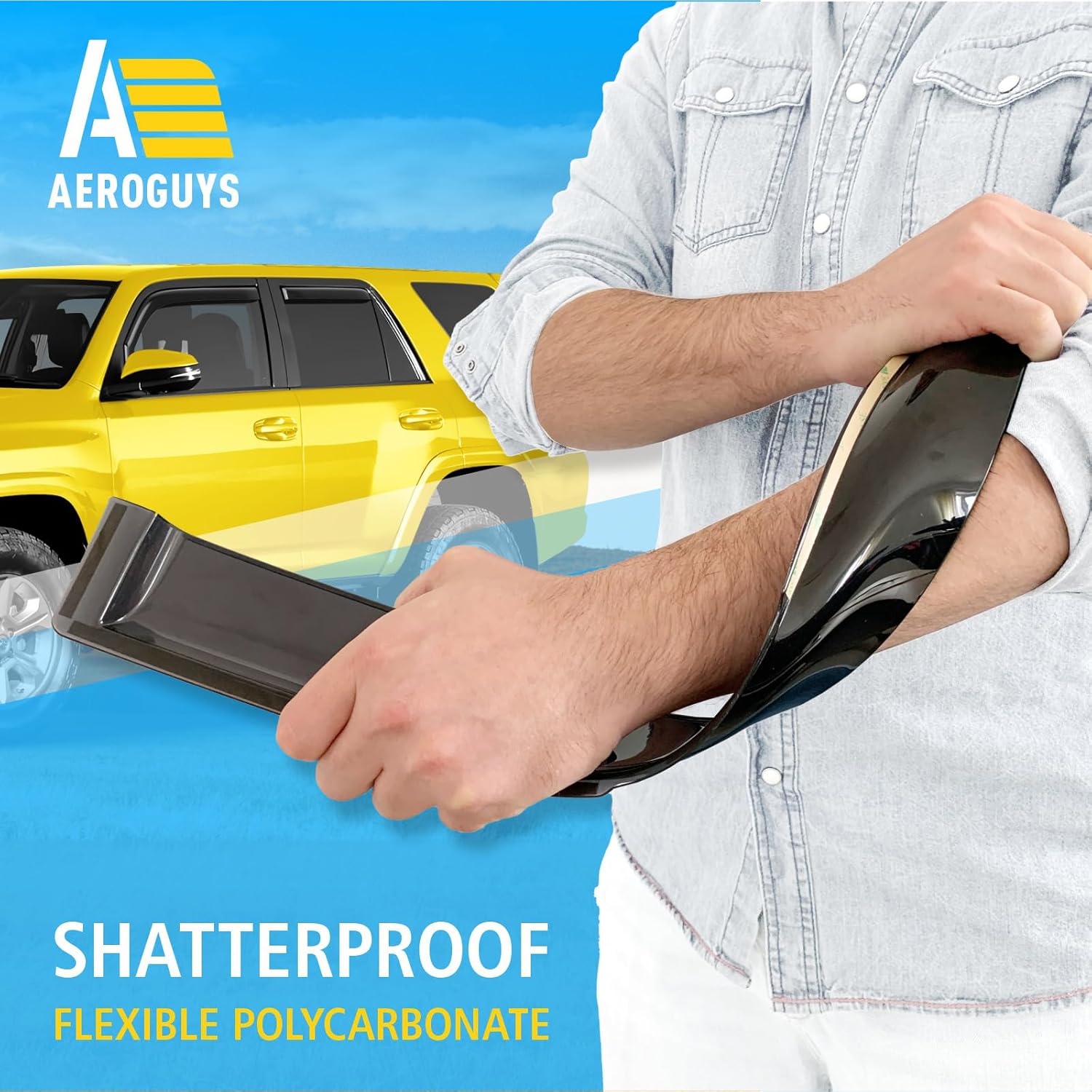 - Incredibly Durable AEROGUYS Auto Window Deflectors – They are made with strong and tough polycarbonate which is clear and scratch-resistant. They also provide UV protection making your ride more comfortable under all weather conditions.