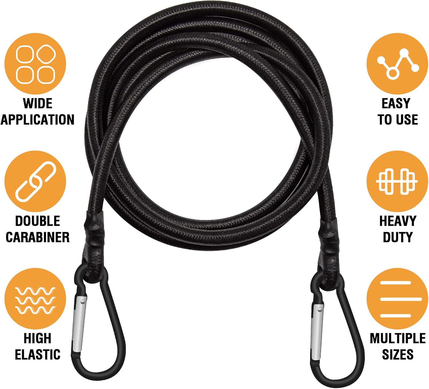 - Bungee Cords Carabiner Assorted Size: 6 pack bungee cord hooks in 3 length, 24" 40" 60",. It has an advantage in both length and width over ordinary bungee cords. It has stronger carrying capacity and can meet your higher requirements. These heavy duty bungee cords are highly elastic and supportive and are compatible with bags of all sizes and weights. Compatible with all bikes, cars, carts, luggage racks, camping, gardening, clotheslines.