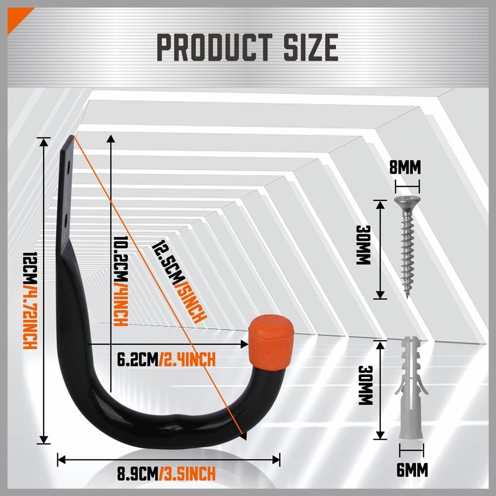 - 6 pack garage storage hooks with 12pcs screws and anchors, hook size: 4.72in x 3.5in(L x W).