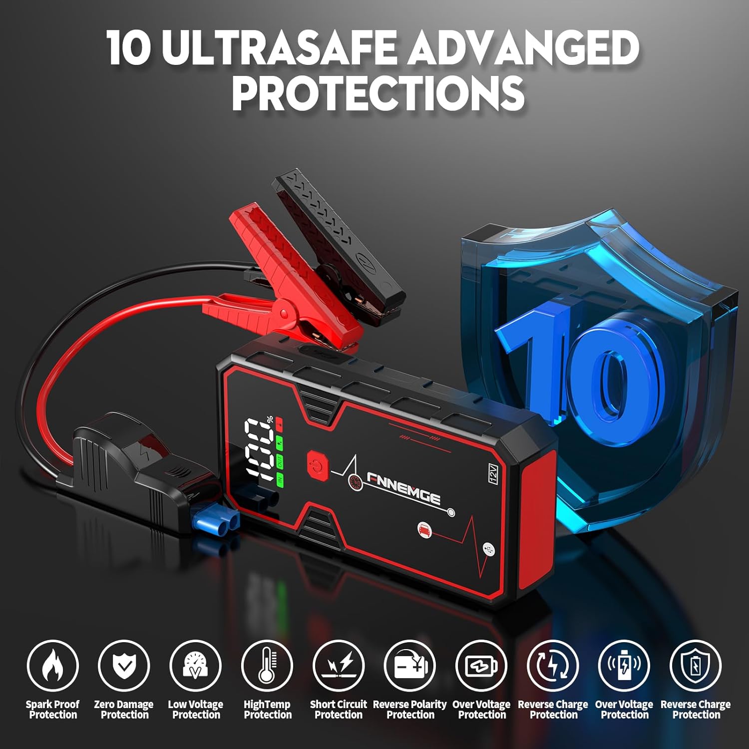 - 🚗 【HIGH POWERED 】 The FNNEMGE car jump starter with 5000A peak current, enabling you to easily start 12V vehicles (up to all gas or 8.0L diesel engines) even in extreme temperatures (-20°F to 70°F). It is suitable for trucks, motorcycles, watercraft, lawn mowers, snowmobiles, and more. Plus, it's easy to use and carry.