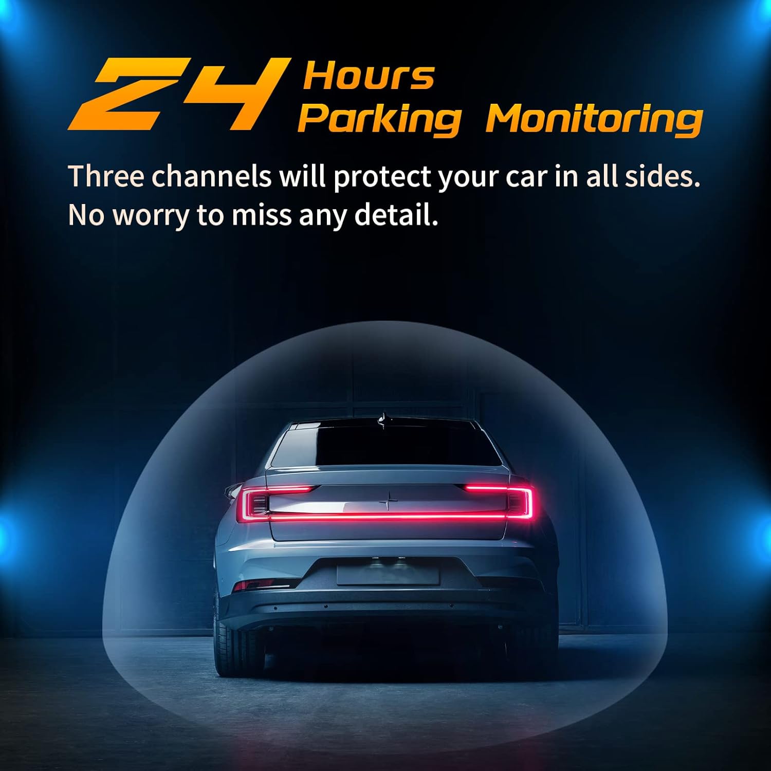 - 【Brilliant Parking Monitoring】When you park the car, the camera lens can adjust to left and right view. It will provide the side view of car, no worry your car will be scratched on the side. The dash cam automatically powers on (Three cameras will turn on together) and starts recording, thus providing you a video evidence if your car is scratched by someone in parking. We recommend to use the hard wire kit (Asin: B07Q29JZZY) installing your dash cam to make the dash cam 24 hours working for you.