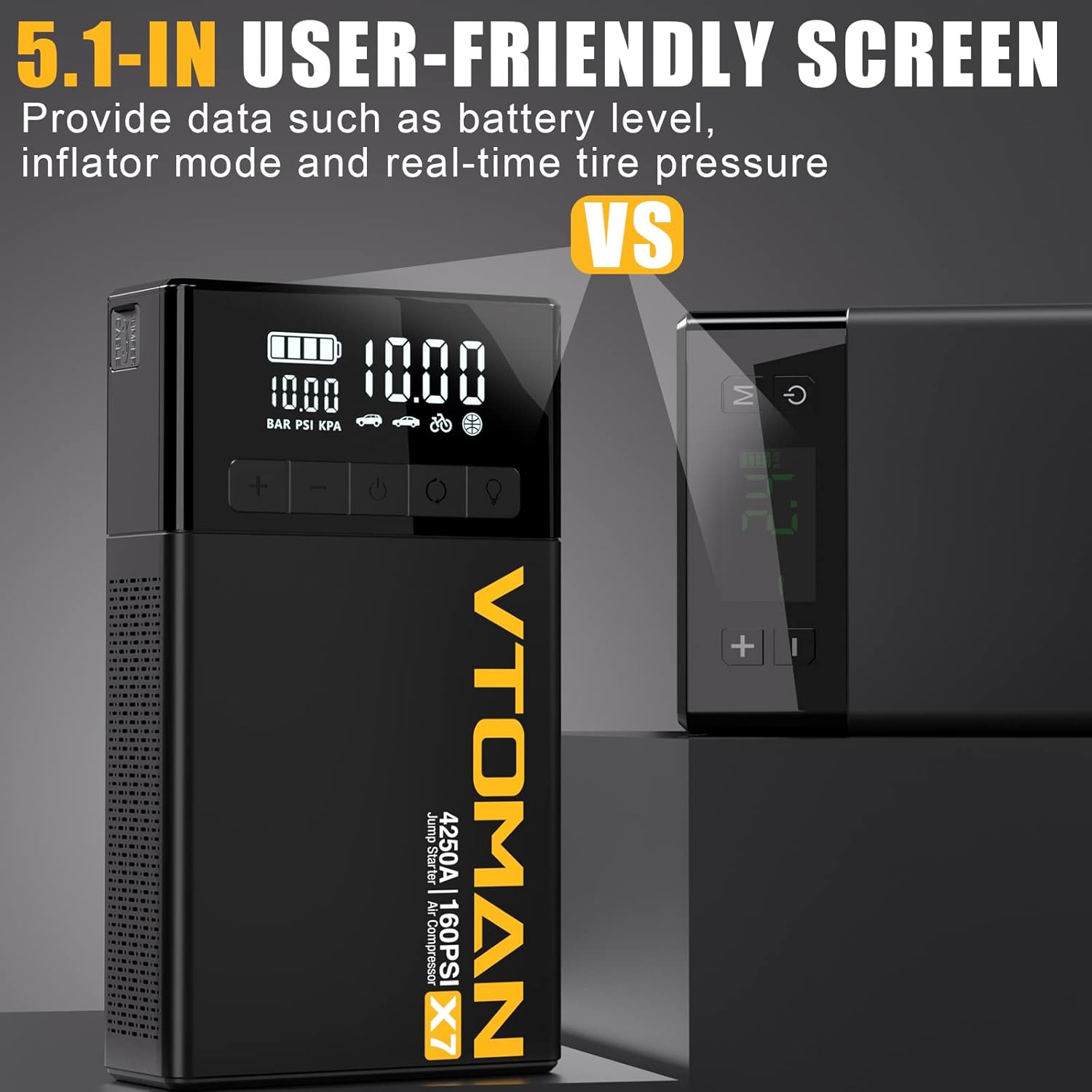 - 5.1-INCH LARGE INTELLIGENT DISPLAY: A user-friendly 5.1-inch smart screen provides you with important data such as battery level, inflator mode and real-time tire pressure, making it easier and clearer to use the X7 battery jumper starter portable