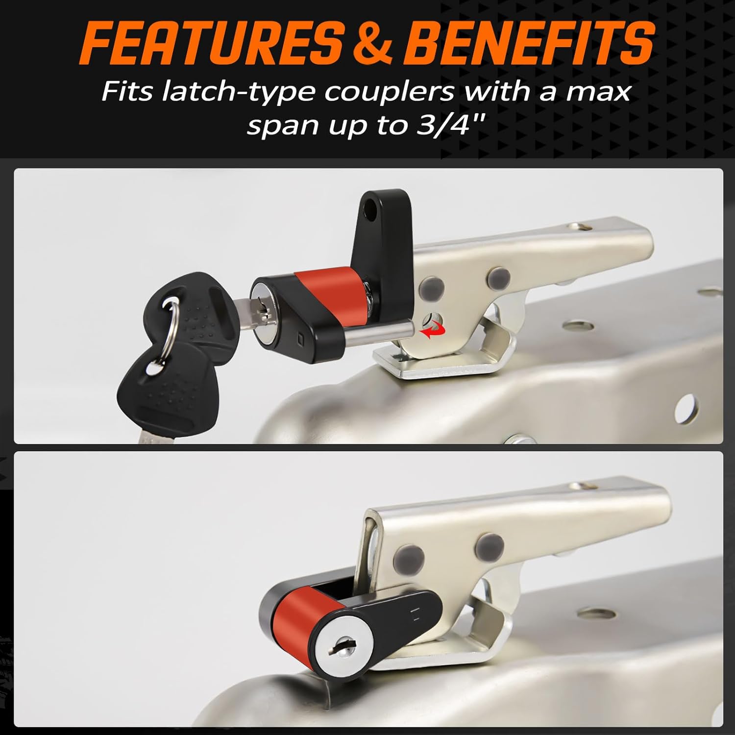 - 【EASY TO USE】- The trailer tongue lock is easy to operate with screw-type locking action -- just turn the key 5-7 times to open or lock, save your time and effort. The coupler lock can be installed quickly and easily so that you can hoop up and head out right away.