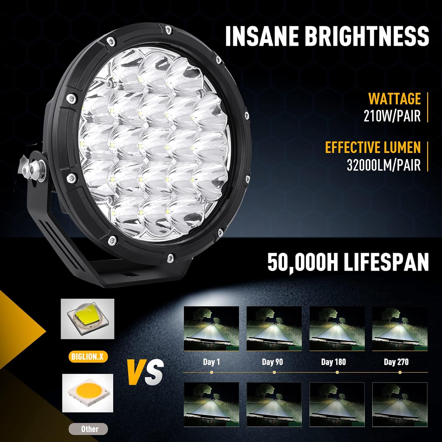 - 【EFFECTIVE&STABLE ELECTRICAL PROPERTIES】Operating voltage range between 11V~32V. Pair 42pcs 5 watts high lumens led chips can output 32000LM. Offroad led light use premium high temperature resistance electronics elements to form high usage circuit, include IC, capacitance and inductance etc. reduce heat generation to make the light bar’s lifespan> 50,000 hours. Led tractor lights meet EMC anti-interference standard. The spot lights can work normally between -40°C ~ 150°C.