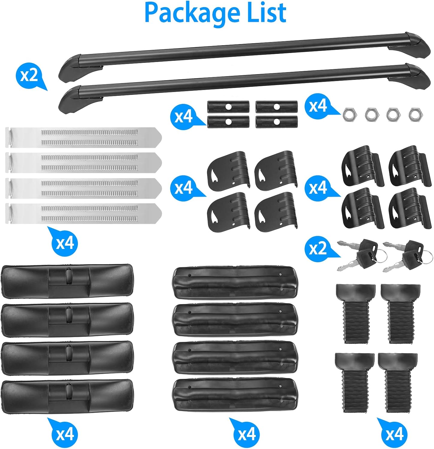 - 【Fit For Most Bare Roof】Universal fit most vehicles with car no side rails roof. It can be easily mounted on most vehicles which the distance between the rain grooves is between 42.91in-44.88in to carry bike, kayak racks, cargo frame, cargo boxes, snowboard, surfboard, etc. The roof rack is the foundation of the roof equipment. You can choose different roof rack accessories depending on the equipment.Pls make sure our roof rack cross bars for your car before you purchase.thank you