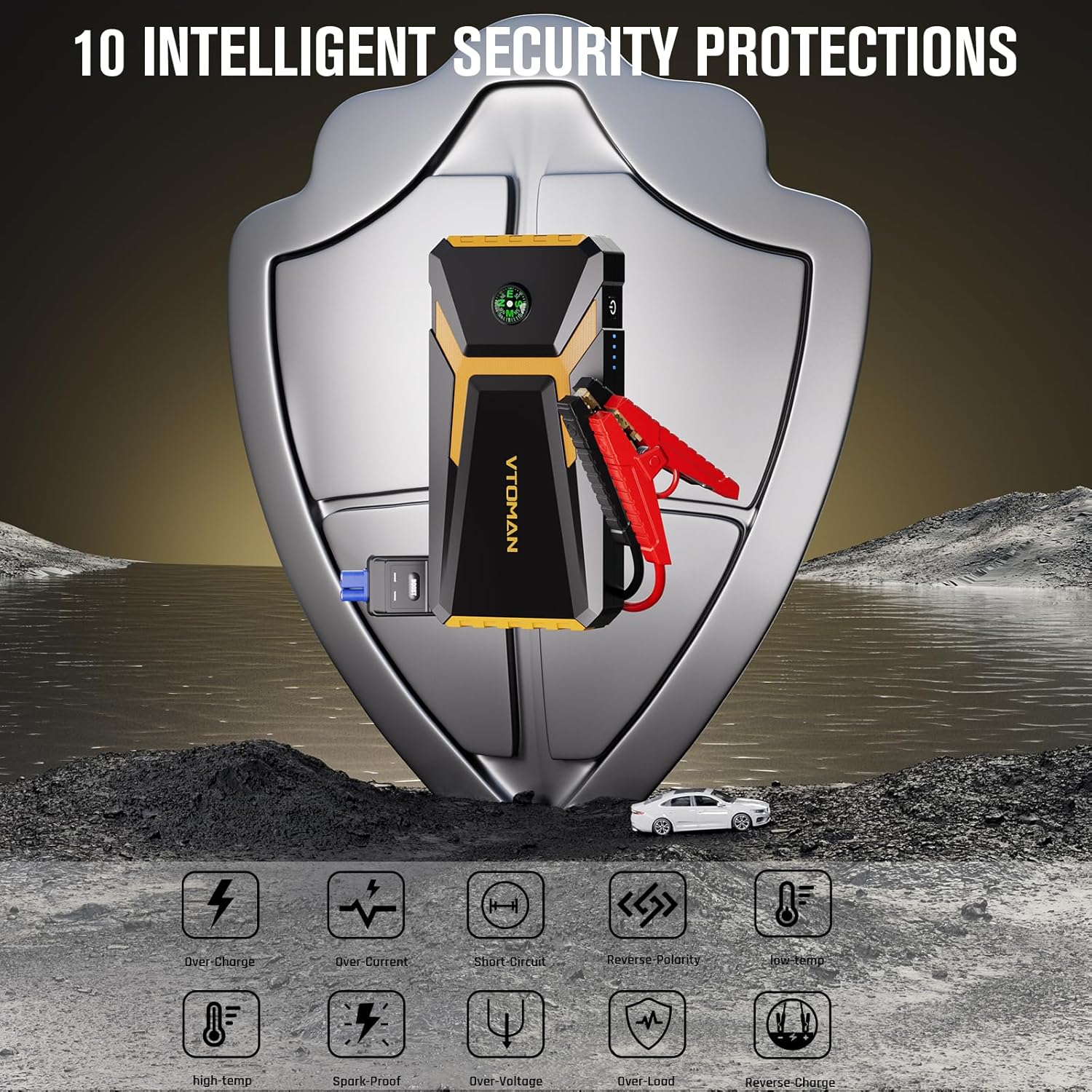 - 10 Intelligent Security Protections - The VTOMAN jump starter pack prioritizes safety and ease of use. The jump cable indicator alerts you with a red light if there’s an incorrect connection. Our advanced system automatically measures the impedance between the clamps and the car battery to ensure maximum starting efficiency and proper Automotive Fit Type, while also preventing incorrect connections or sparks.