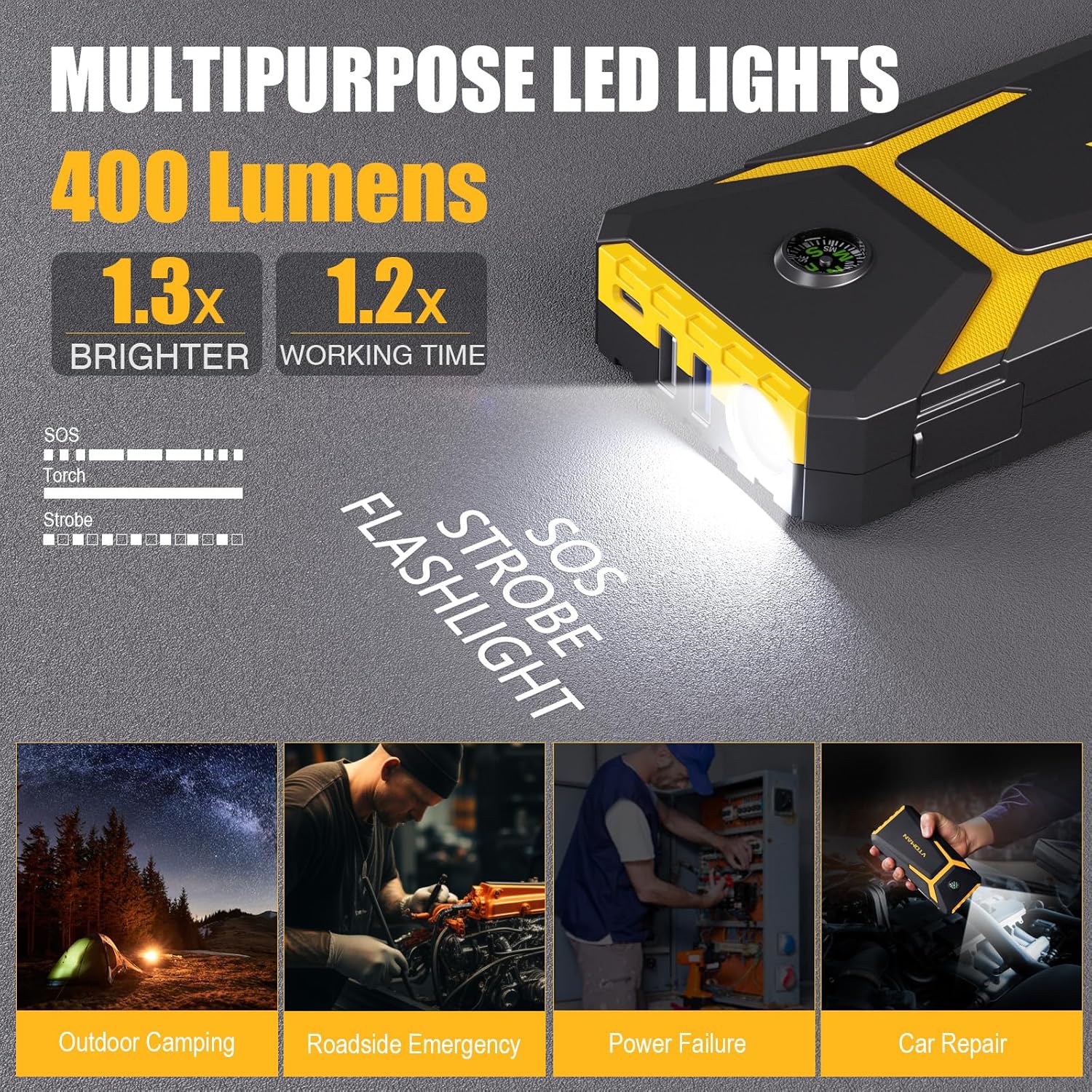- More Than a Jump Starter - The V6 Pro jump box features a Type-C input port for PD 15W fast charging, taking only 3.3 hours to charge from 0% to 100%. This jump starter battery pack is also designed with 2 USB outputs (5V/2.4A and 5V/9V/12V) to power various electronic devices. Additionally, it includes a 300-lumen LED light with 3 modes (Normal, Strobe, SOS), making it ideal for outdoor adventures and field rescues.