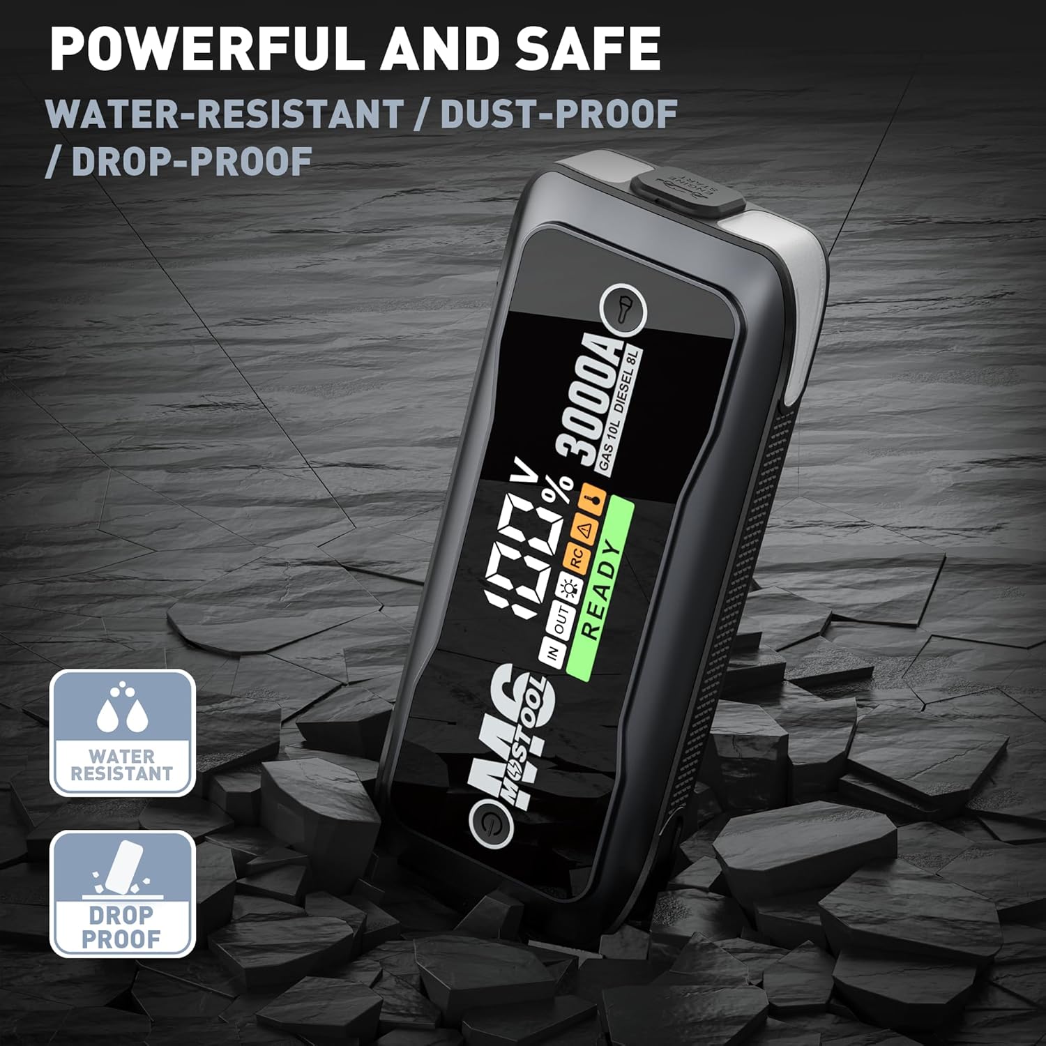 - 🚗 【Confident Starts, Every Time】The MOSTOOL M6 car jump starter delivers 3000A peak current to jump-start all 12V vehicles with ease, including sedans, SUVs, pickups, and motorcycles. This portable jump starter supports gas engines up to 10.0L and diesel up to 8.0L. Whether you're driving daily or exploring off-road, this compact jump starter is your reliable power solution in every situation