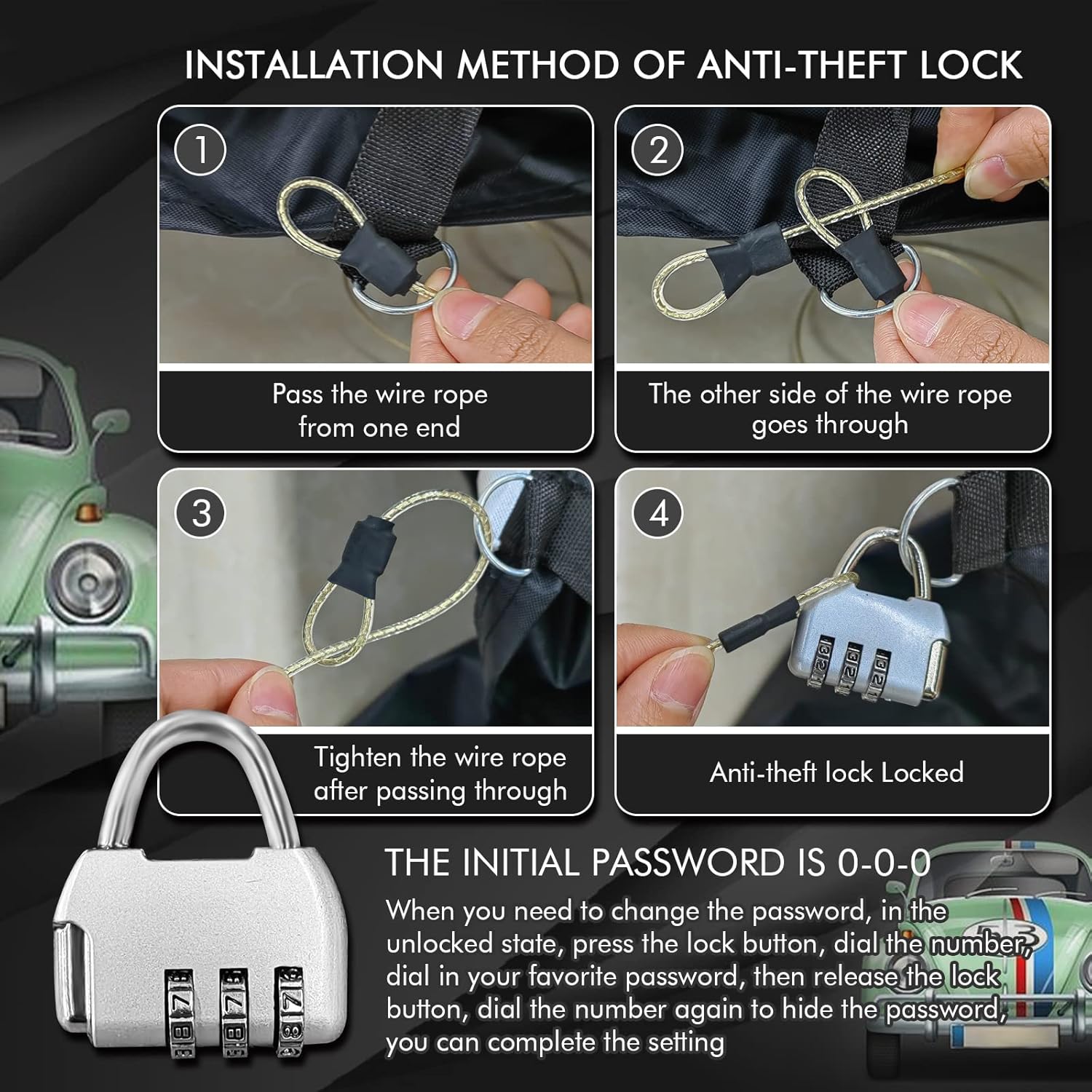 - 🚙【Upgrade Windproof Design】①A windproof fixed buckle pass through the middle of the car for easy fixing; ②2 windproof belts at the front and rear; ③4 straps to tie the cover to the four wheels; ④Elastic band at the bottom can easily adjust the size of the cover; ⑤Double stitching ensures that the cover will not tear easily, making it more durable; ⑥The included safety latch secures the cover. Multiple upgraded designs keep your protective cover from being blown away even in strong winds.