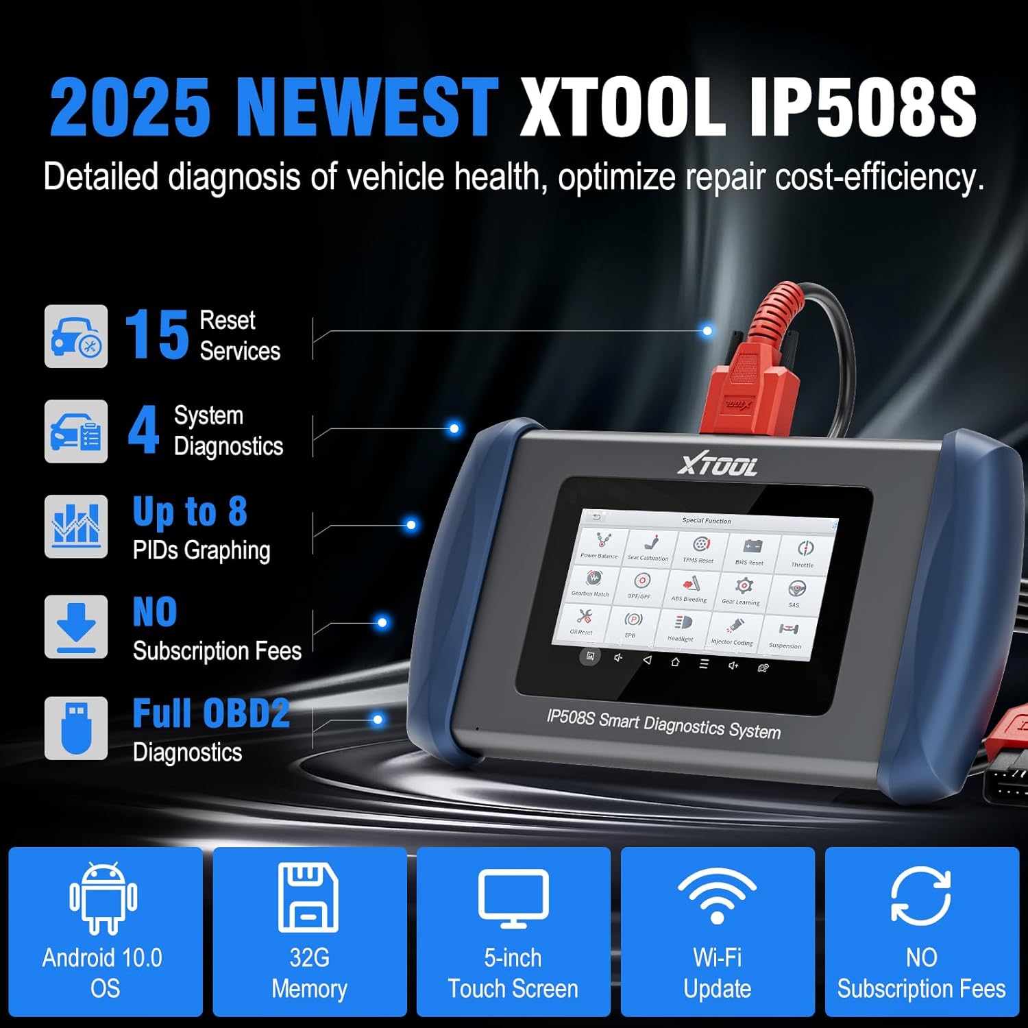 - 2025 Upgraded Hardware + One-Click Wi-F! Update + No Software Fees: With 2025 upgraded hardware, XTOOL IP508S Scanner OBD2 ensures fast and responsive performance. The vehicle diagnostic scanner provides up to 8 PIDs for live data visualization, making it easier to analyze and interpret vehicle health. Whether you need to conduct OBD2 transmission diagnostics, perform ABS brake bleed, or check for SRS faults, the tool offers a smooth and intuitive experience. Plus, you can update the software with a simple one-click Wi-Fi update, keeping your device up-to-date without additional fees or subscriptions and ensuring your obd2 scan tool stays current with no hidden costs!