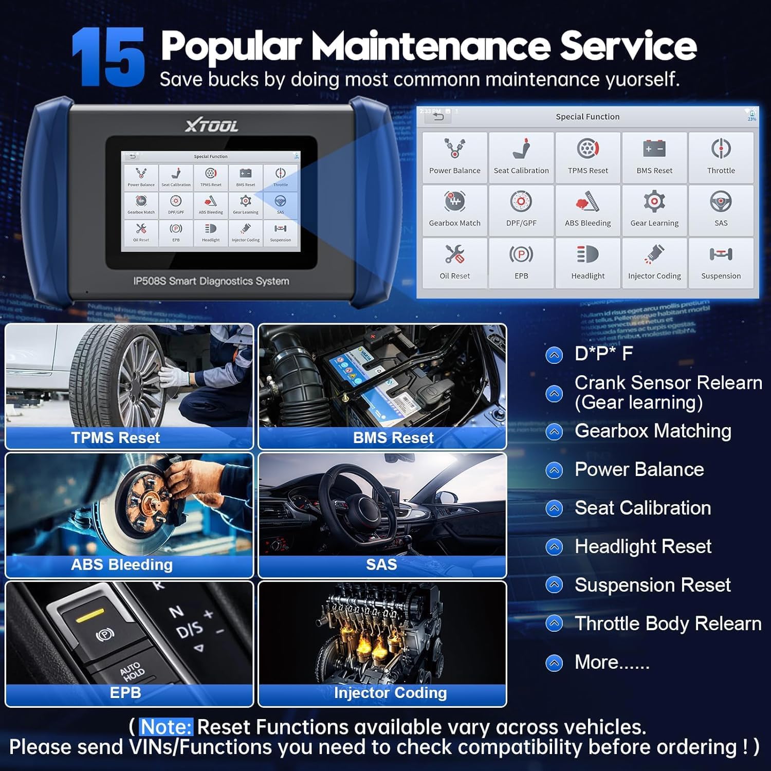 - Comprehensive OBD2 Scanner with 15 Resets: XTOOL IP508S Scanner for car features 15 essential reset services, including oil reset, ABS brake bleeding, SAS calibration, EPB, BMS reset, and throttle adaptation. Advanced options like TPMS reset, injector coding, gear learning (crank sensor relearn), gearbox matching, power balance, seat calibration, headlight reset, suspension, and D*PF make this car scanner a versatile diagnostic tool. Ideal for routine maintenance and advanced resets, XTOOL IP508S engine, transmission, ABS, and SRS scanner delivers top-notch functionality at an affordable price!