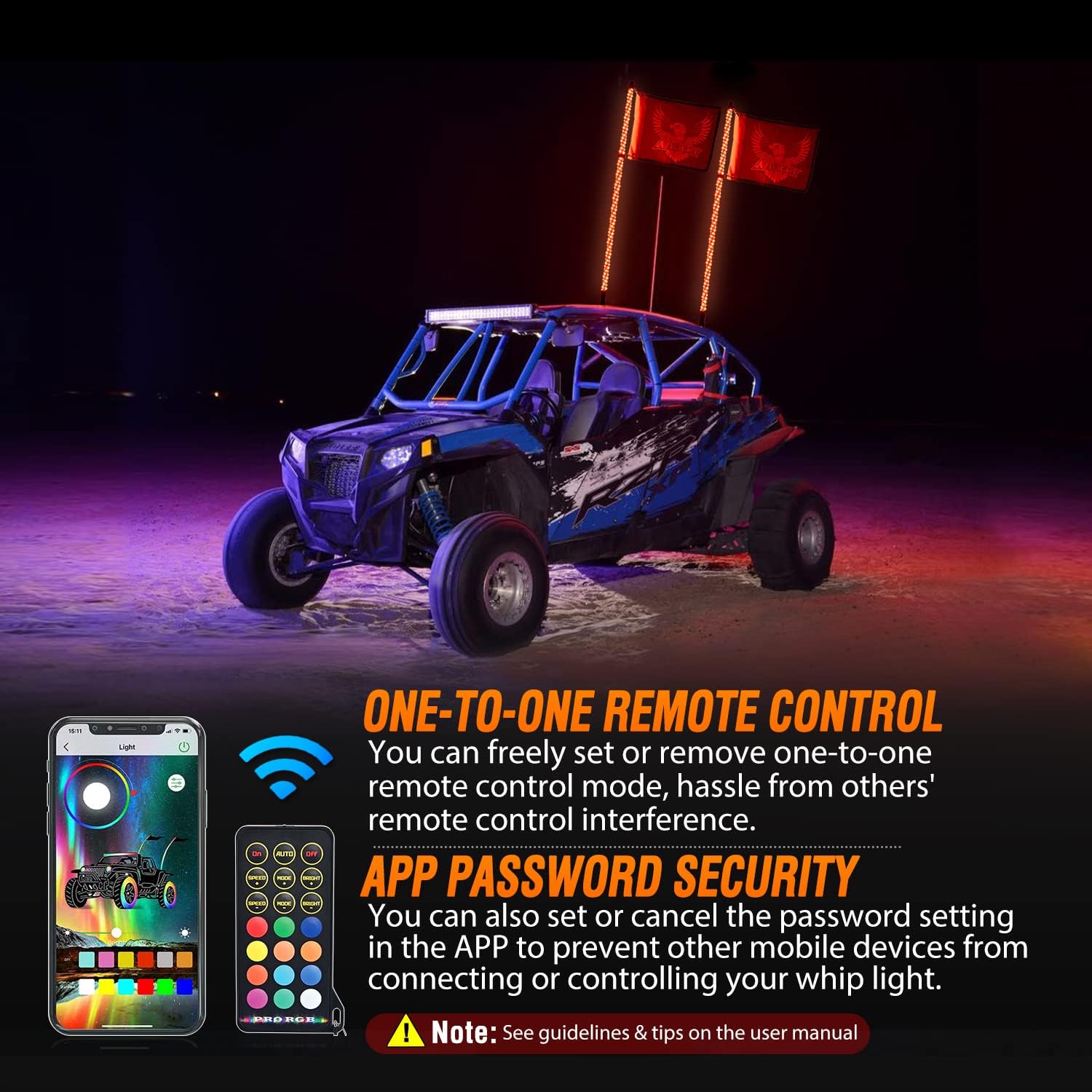 - 【No Interefence Controlled by Remote & APP】In addition to the one-to-one control lock on the remote to solve the interference problem, we also set a security password on the APP. After the password is set successfully, other mobile devices cannot connect to your whip light without the password.(Note:See guidelines of rocker switch connection on the user manual)