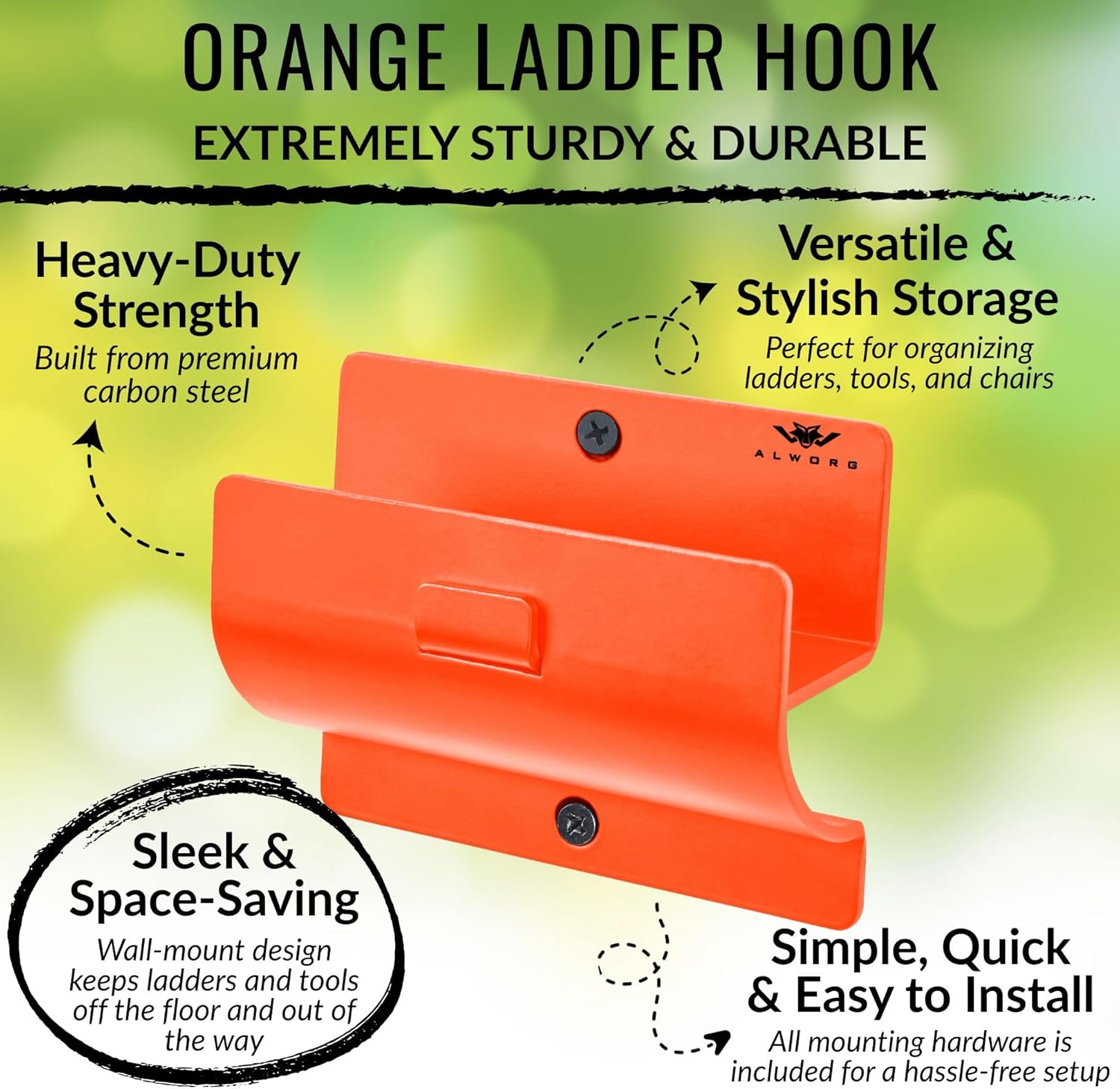 Orange Garage Storage Hooks - Heavy Duty Ladder Wall Mount, Wheelbarrow Hanger, Tool Holder, Hanging Brackets for Ladders, Folding Chairs