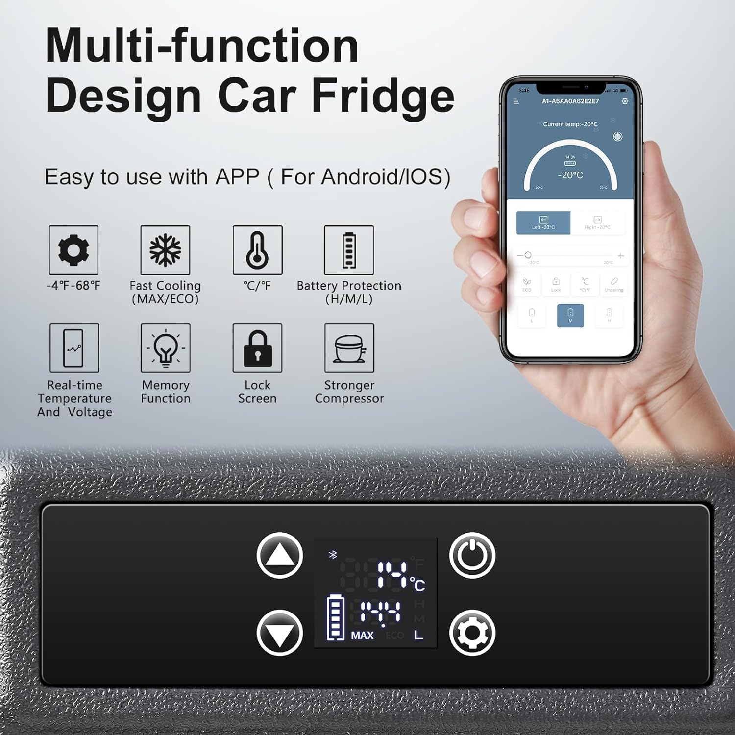 - 【ECO/MAX Modes and APP Control】portable refrigerator has two modes options.The fast cooling(MAX) mode only 15 mins cooling down from 68℉ to 32℉.The energy saving(ECO) mode is normal cooling speed that can reduce power consumption.Besides,You can use APP to control this car fridge from distance or in car.Intelligent temperature control function to meet the required temperature of various ingredients.
