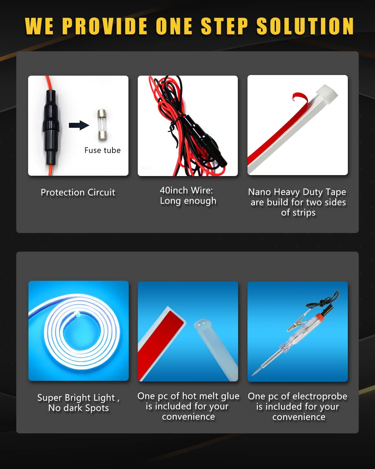 - 【Fuse Protection】The Car led strip light is made of soft silicone with heavy duty Nano Tapes on both sides,Super Bright,No dark Spots.Short circuit protection to enhance the safety.