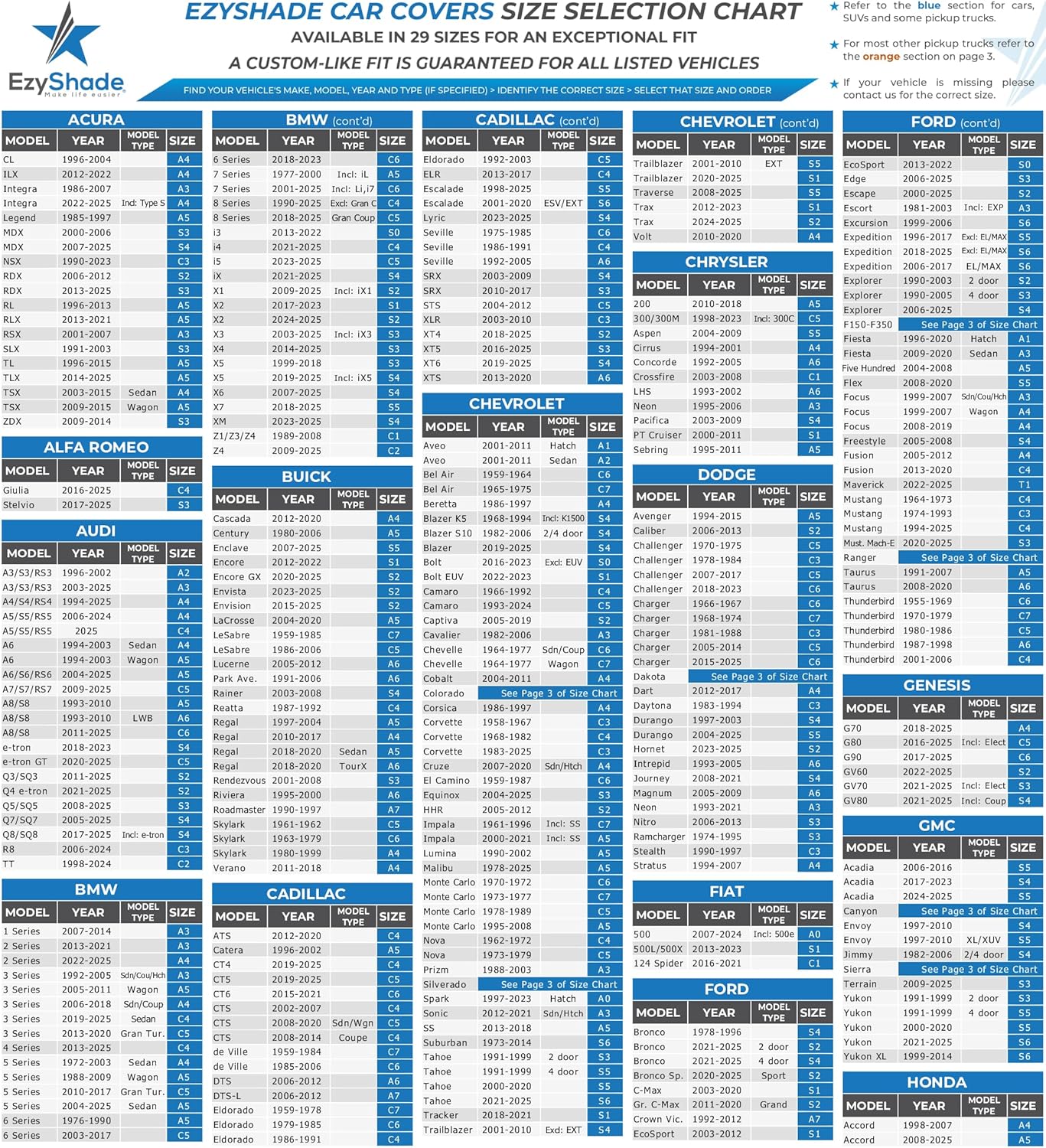 - EXTENDED WARRANTY. VIP SERVICE. EzyShade customers have long benefited from generous product warranties and industry-leading customer service. All EzyShade products with a Vehicle Size Chart (car covers included) even come with a Great Fit Guarantee!
