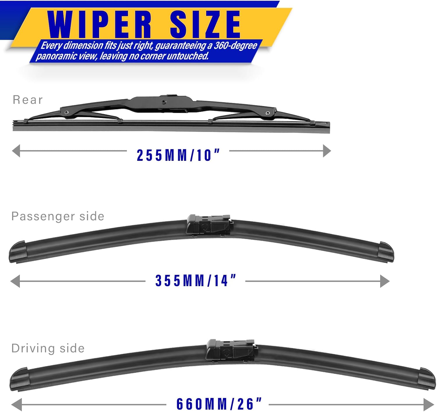 - 【WORRY-FREE SHOPPING】 3Pcs wiper blades 26"+14"+10" and Instruction Manual. One Year warranty! Refund or return anytime in one year, Long life, smooth engagement.