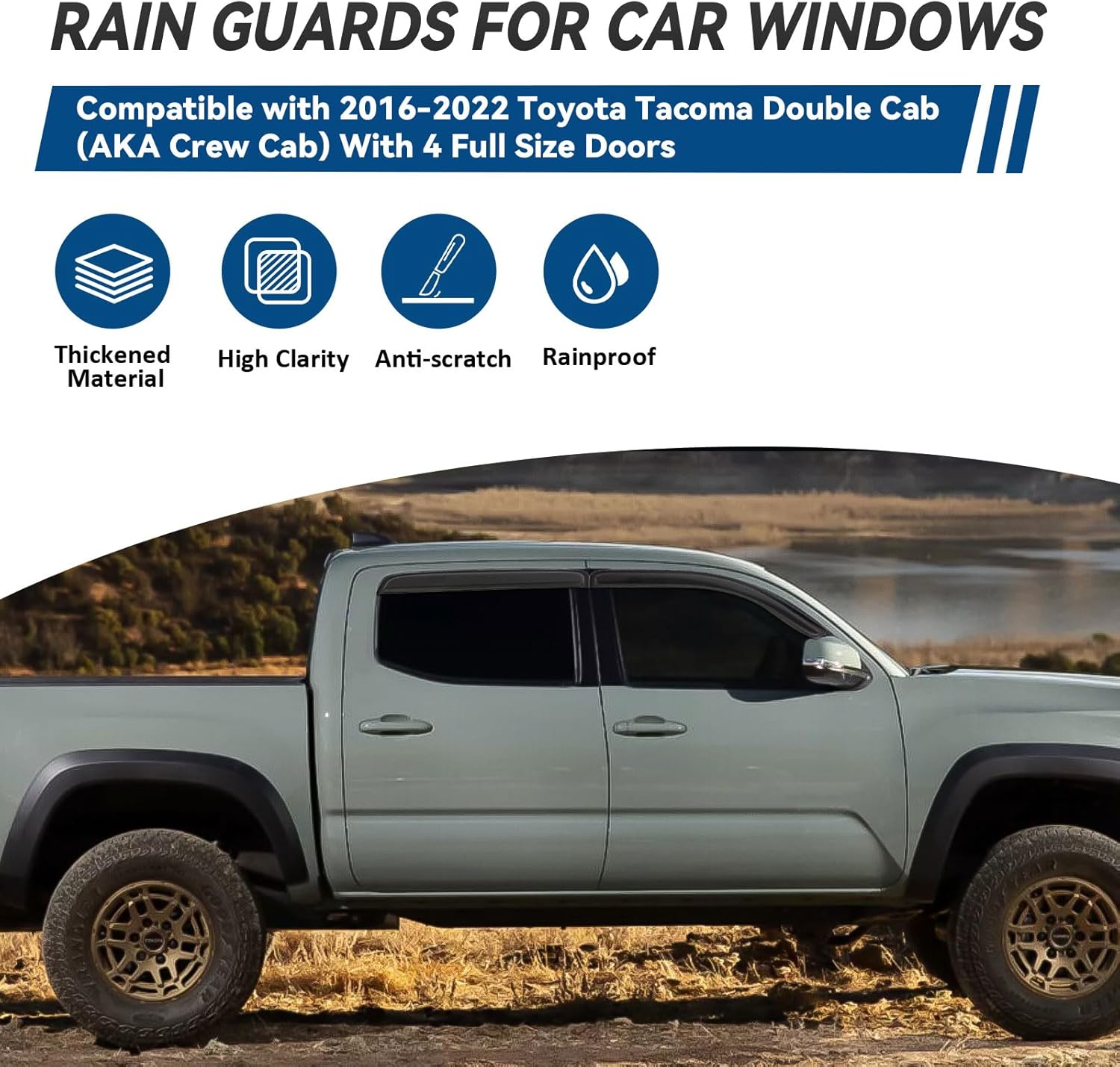 4pcs Front+Rear Smoke Tint Sun/Rain Guard Outside Mount Tape-On Vent Window Visors Compatible with 16-22 Tacoma Double/Crew Cab with 4 Full Size Doors
