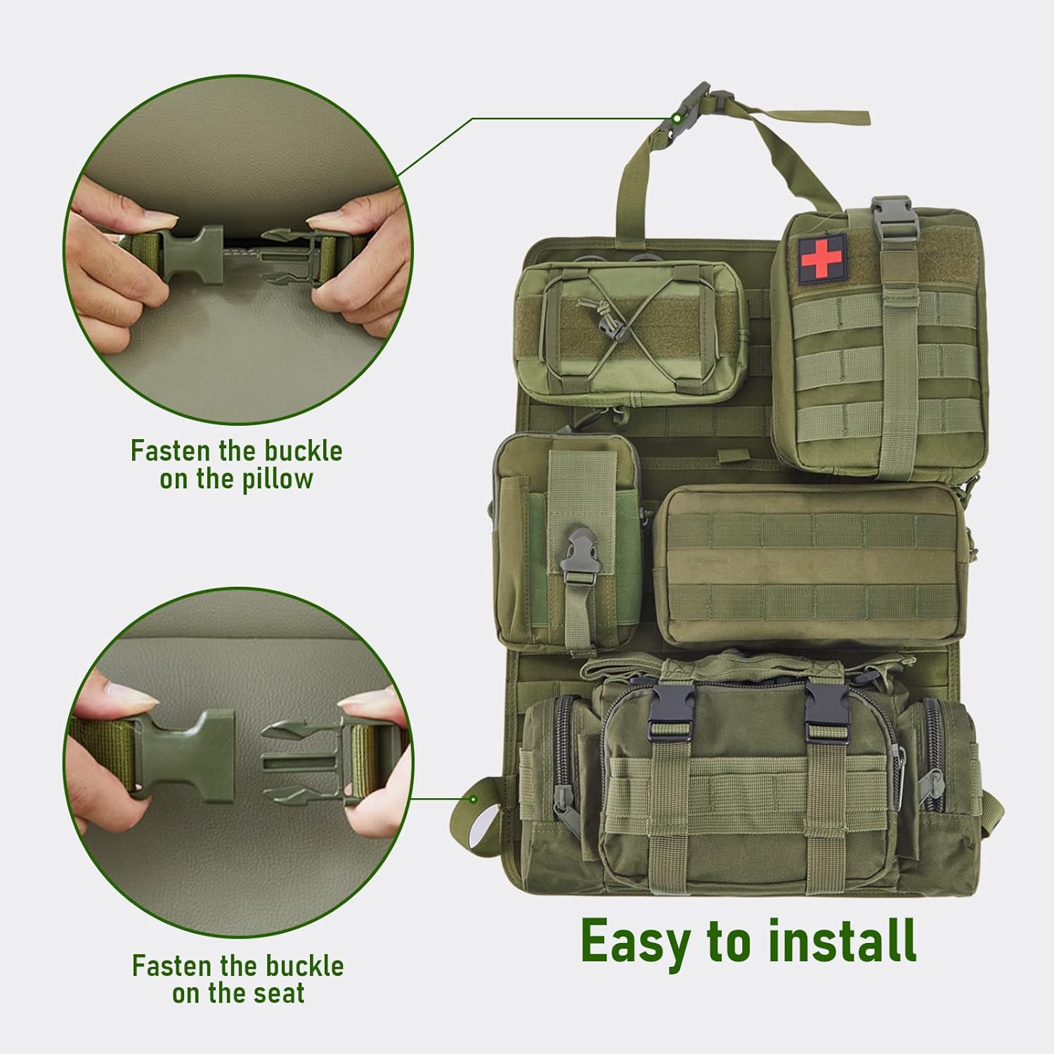 - 🚗 Easy Installation - With adjustable strap,easily adjust to fit around your headrest and at the bottom between the seat back and base.Each Molle bags has been designed with velcro tape and buckle, each pouch is flexible to be added or removed.